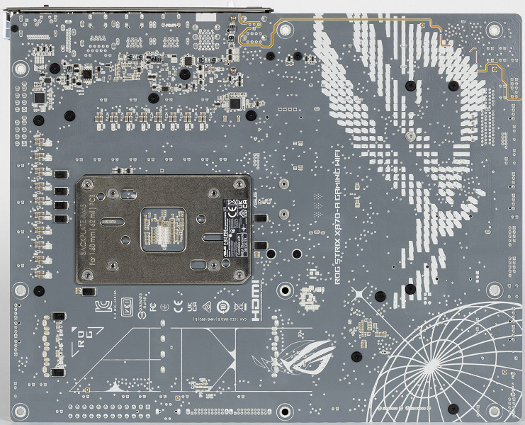 На оборотной стороне расположено несколько контроллеров и традиционная некоторая логика. Текстолит обработан хорошо: во всех точках пайки острые концы срезаны, а также отшлифовано. Защитной пластины (бэкплейта) нет. Занятно, что оборотная сторона платы покрашена в серый цвет, при этом дизайнеры нанесли на эту сторону еще и ряд рисунков. Жаль, что такую красоту мало кто увидит (только покупатель матплаты, ну и сборщик ПК, и то на короткое время).