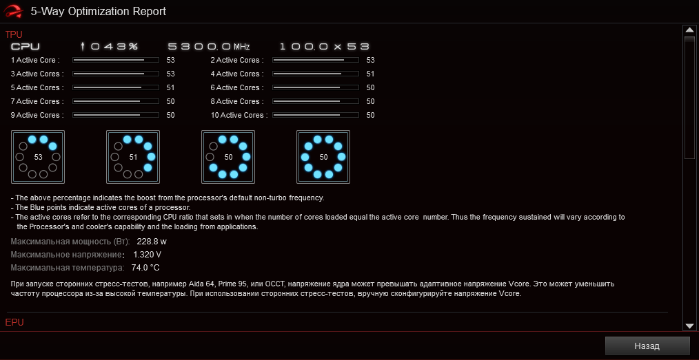 В общем в который раз делаю вывод, что инженерам Asus еще работать и работать над ИИ, заложенным в основу работы AI Overclocking. Потому что неопытный геймер полезет включать все это (ну раз есть возможность включить авторазгон даже из простого меню, то как бы специалисты производителя должны понимать, что ими могут воспользоваться все кому не лень) и получит не только излишний перегрев процессора, но и преждевременное старение данной микросхемы (у процессоров нет пластических хирургов, им после деградации ничего не поможет). Хотя, конечно, я тут утрирую: даже в случае долговременной работы на повышенных вольтажах процессор успеет морально состариться прежде чем придет физический износ.