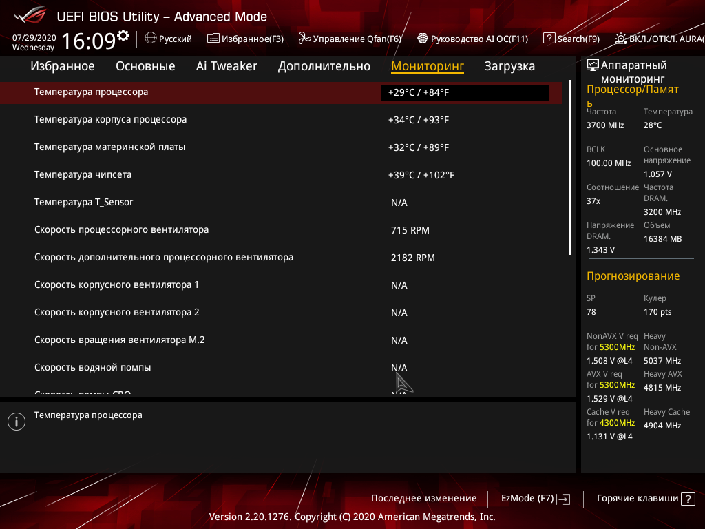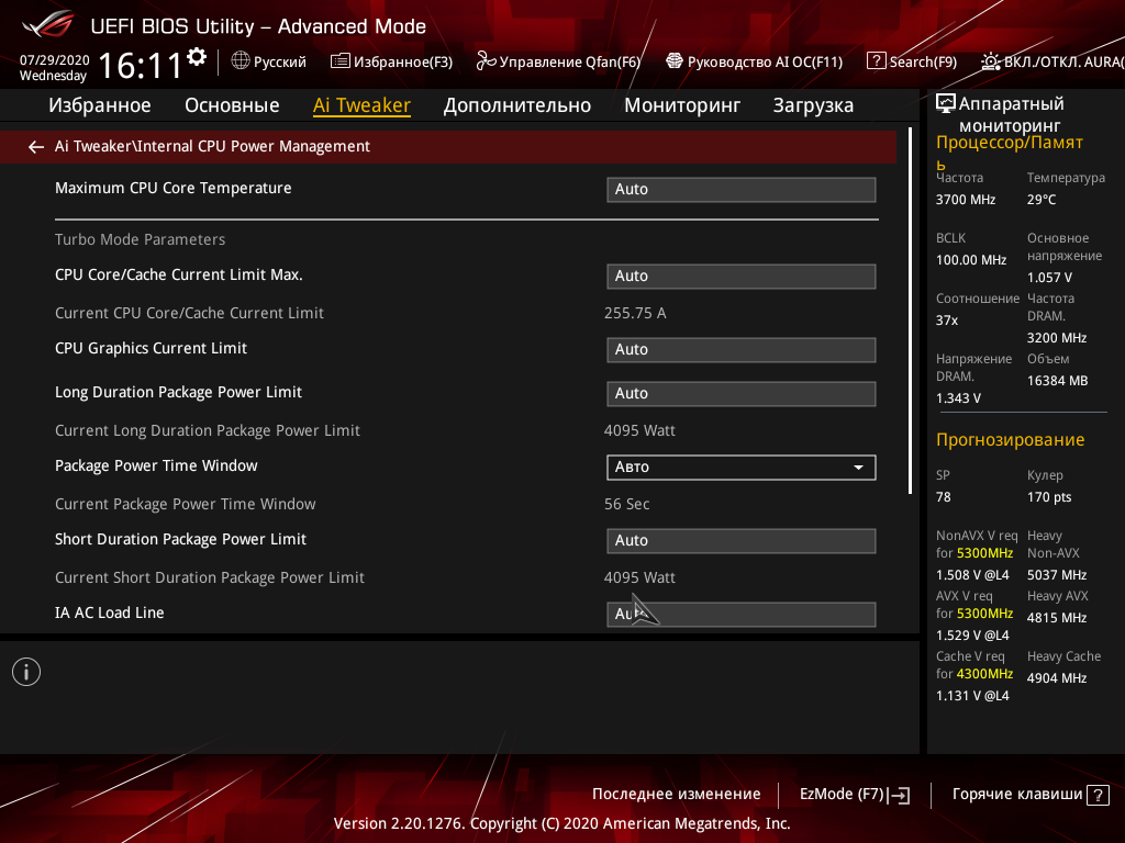 Как и в случае ROG Maximus XII Extreme, видим, что само по себе включение AI не включает MCE, интеллектуальный разгон пытается работать в рамках PL2. Но! Вольтаж на ядрах уже почти 1,5 В! Ну и нагрев повысился, хоть еще и не критичный.