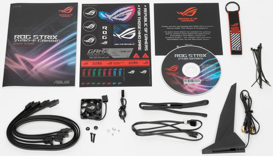Комплект поставки традиционен для серии Strix. Кроме традиционных элементов типа руководства пользователя и кабелей SATA, имеются: выносная антенна с подставкой для беспроводных соединений, разветвители для подключения подсветок, винтики для монтажа модулей M.2, дополнительный вентилятор VRM с крепежом, накопитель c ПО типа CD, стяжки, бонусные стикеры, брелок и наклейки.