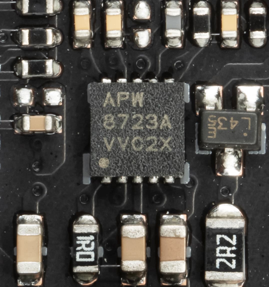 Через ПО или BIOS контролируется 6 гнезд для подключения воздушных вентиляторов или помп: они могут управляться как через ШИМ, так и банальным изменением напряжения/тока, для этих целей имеется контроллер APW8723 от Anpec Electronics.