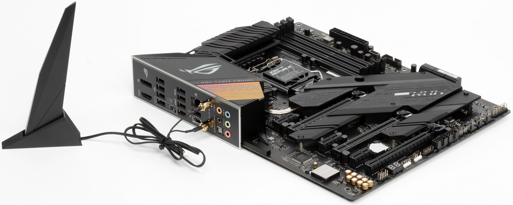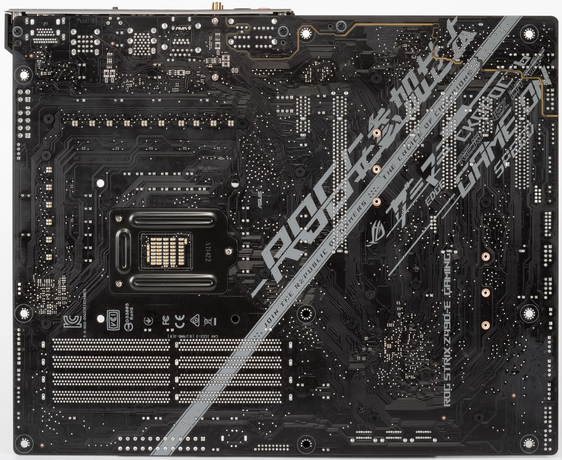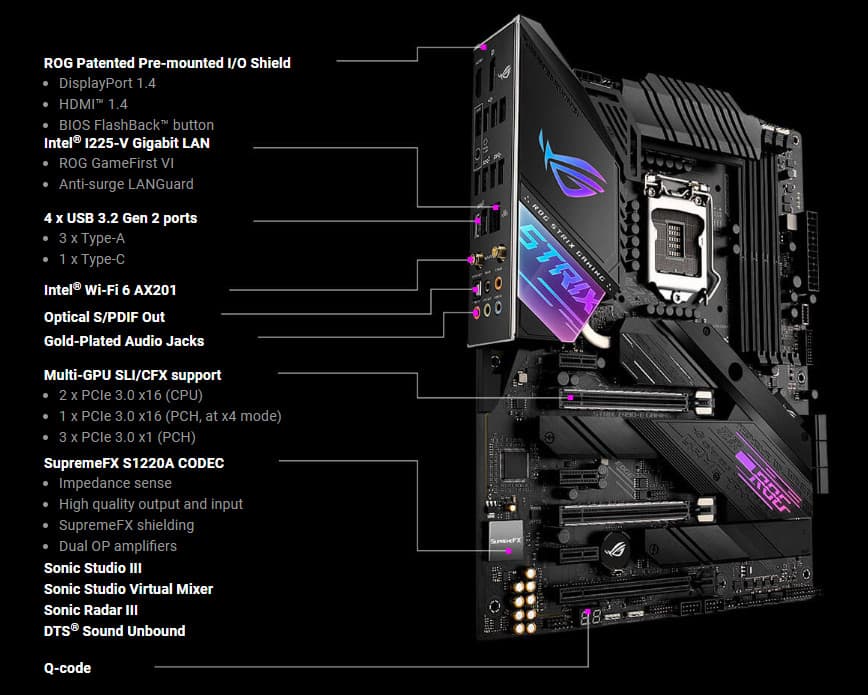 Итак, ROG Strix Z490-E Gaming. Понятно, что плата для геймеров, раз в ROG. Да и лишний раз суффикс Gaming это подчеркивает. Также понятно, что раз не Maximus, то никаких «фенечек» типа «нажми кнопку, и процессор вылетит из сокета» нет. А что осталось тогда? Вот и разберемся.