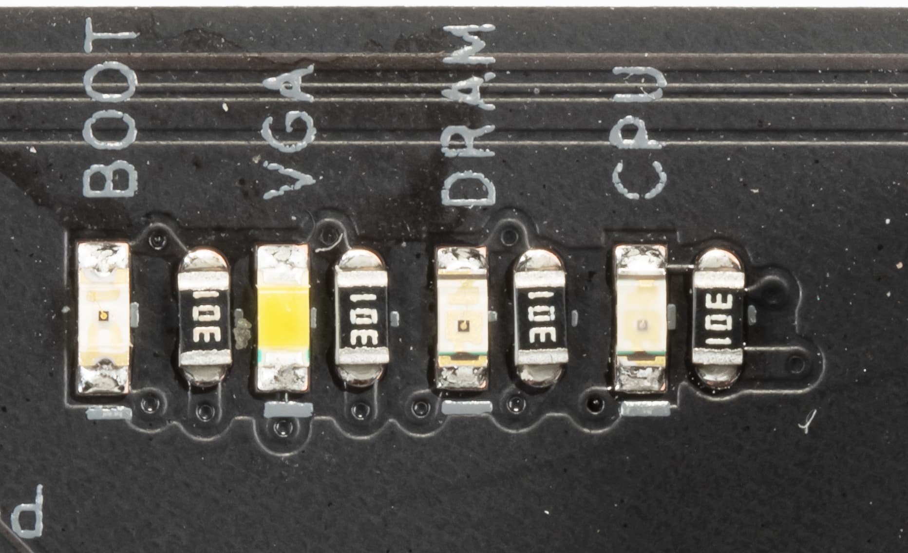 У платы еще есть световые индикаторы, сообщающие о проблемах с тем или иным компонентом системы.