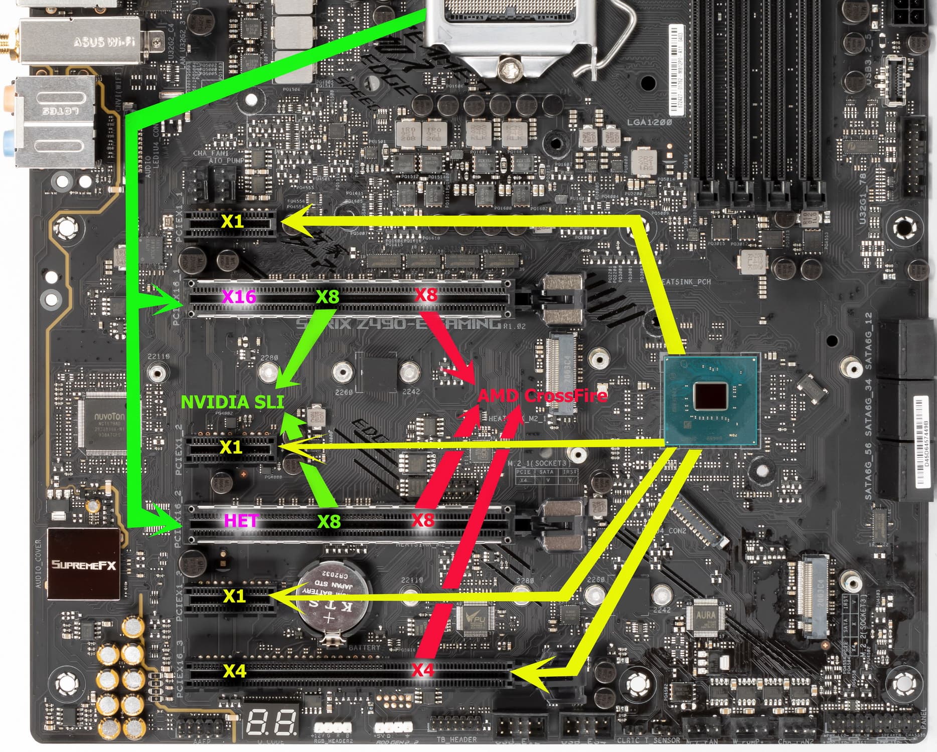 Ниже полная схема распределения ресурсов по слотам PCI-e