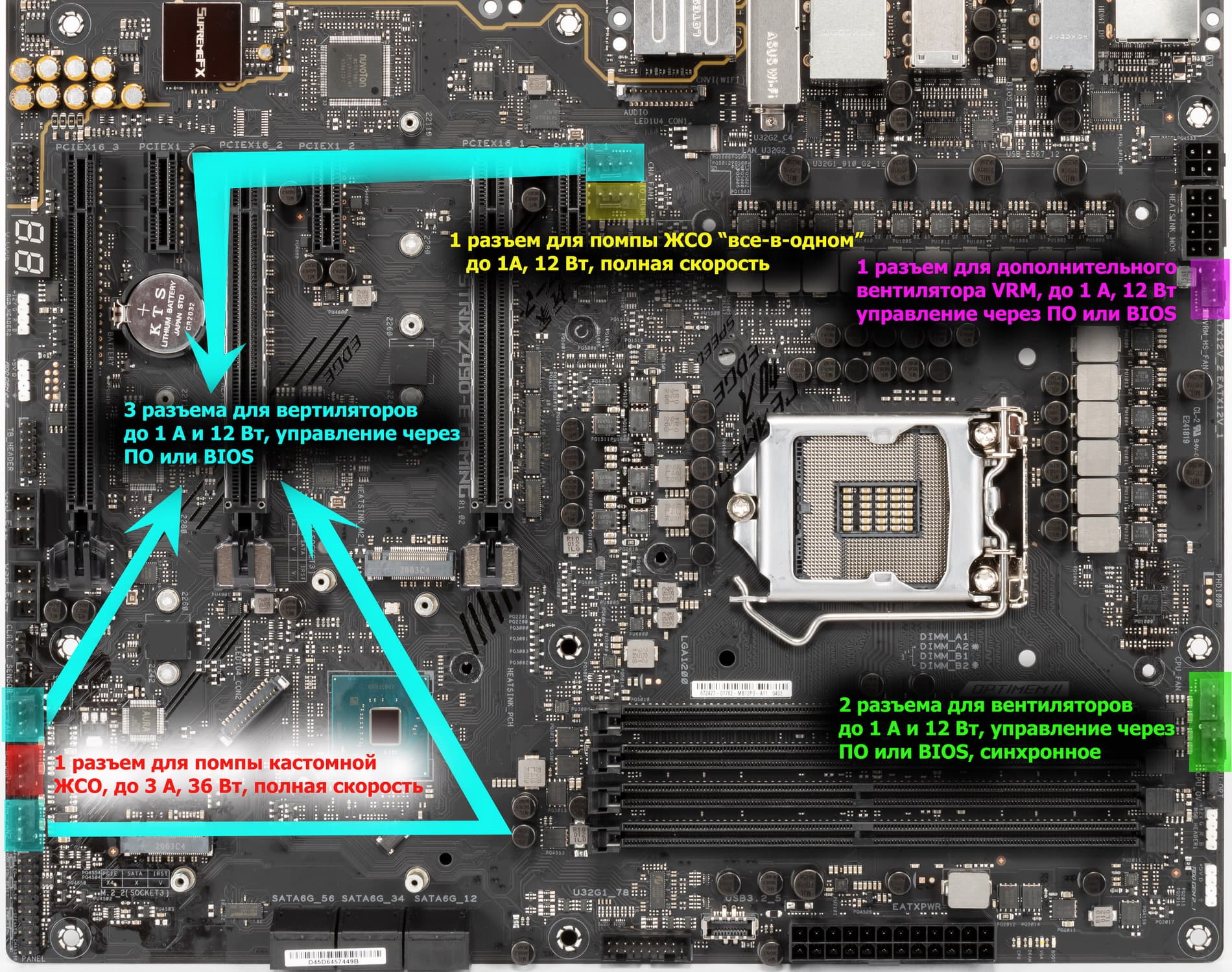 Теперь про блок ввода-вывода, разъемы для подключения вентиляторов и т. п. Разъемов для подключения вентиляторов и помп — 8. Схема размещения коннекторов для систем охлаждения выглядит так: