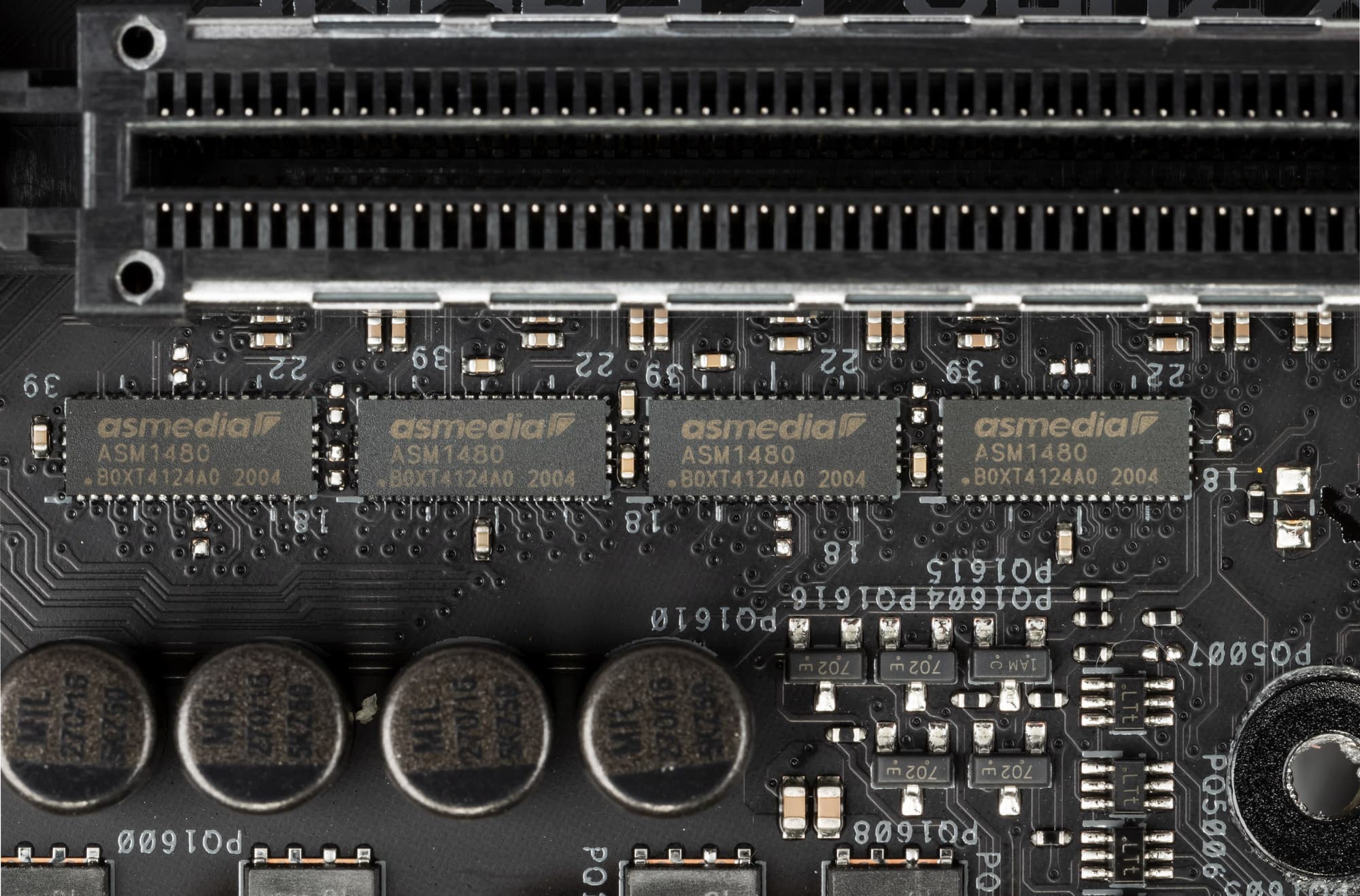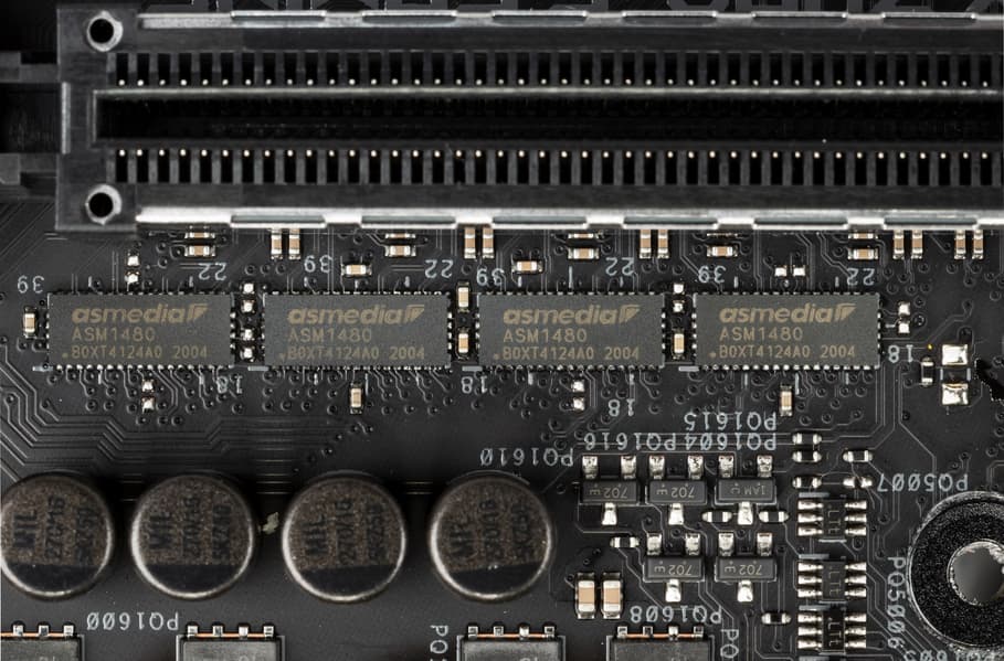 У данной платы распределение линий PCIe между слотами в случае использования более одной видеокарты неоднозначное, поэтому востребованы мультиплексоры ASM1480 от ASMedia.