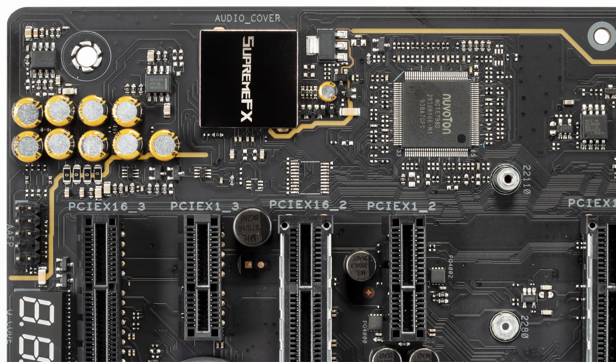 Расположение PCIe слотов позволяет легко смонтировать СО любого уровня и класса. Обычно используемый в топовых матплатах внешний тактовый генератор здесь обнаружен не был, как и нет усилителей (ре-драйверов) шины.