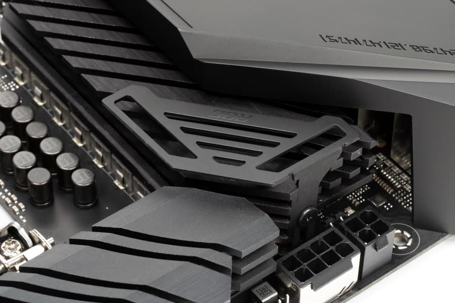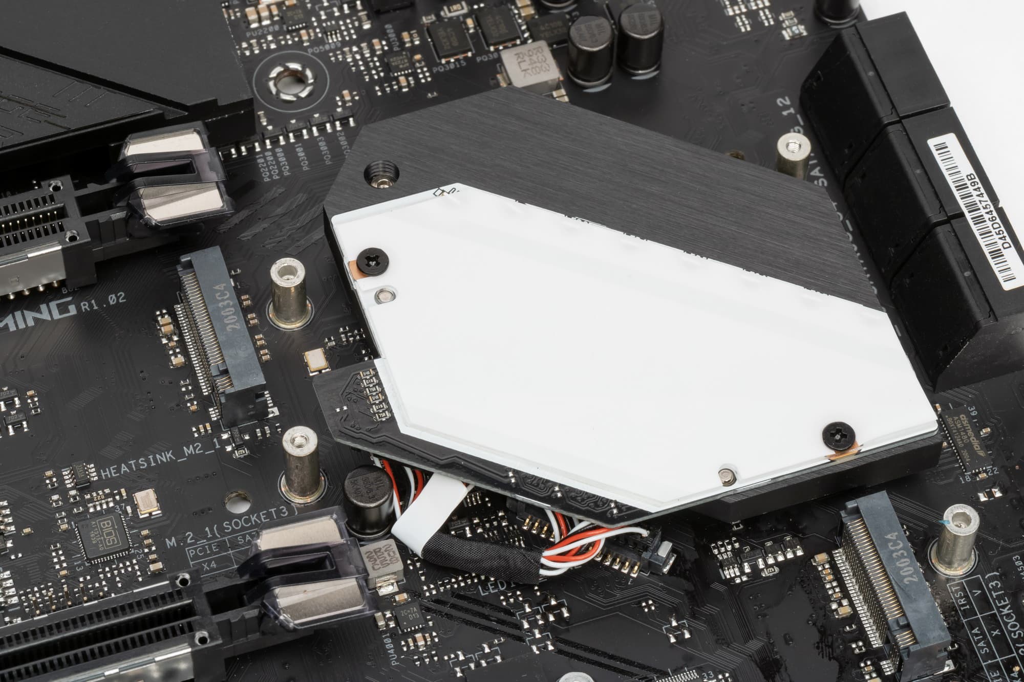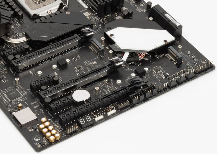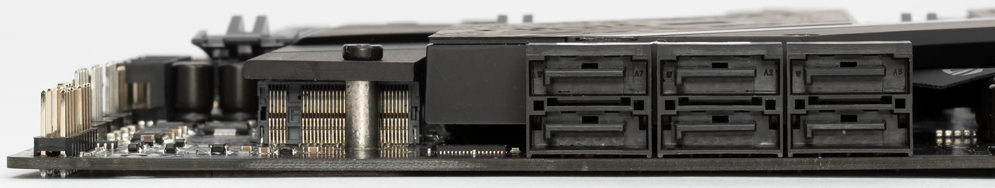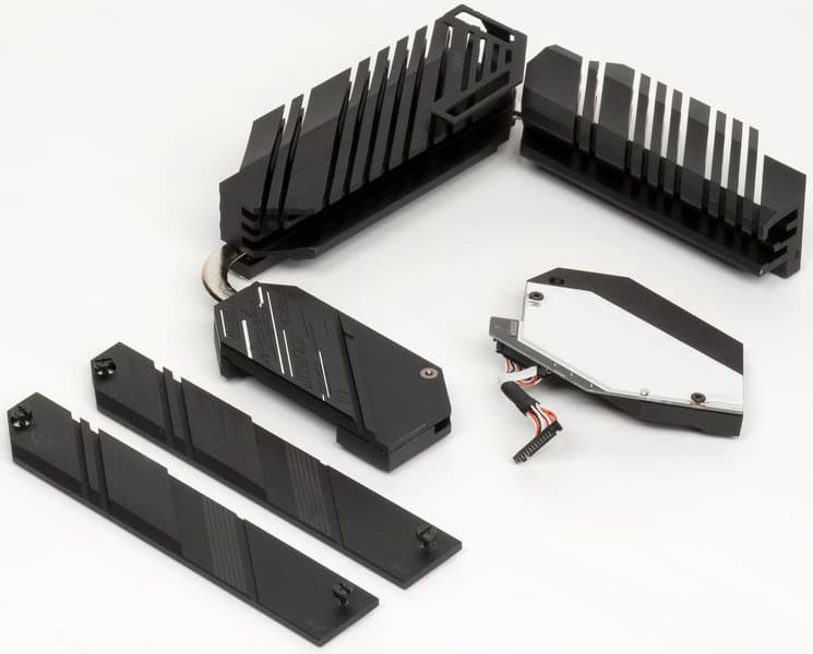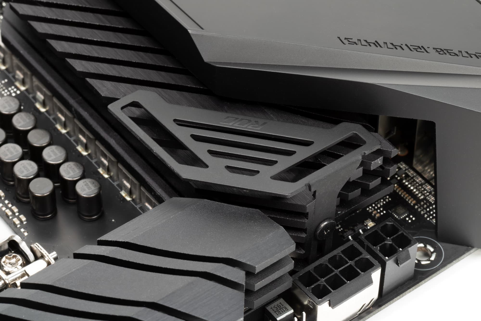 Оба M.2 слота на самой матплате оснащены радиаторами. Нижний M.2_2 имеет радиатор, который не связан с какими-то иными устройствами охлаждения на данной плате. Верхний M.2_1 имеет радиатор, конец которого — под крышкой чипсетного радиатора, без демонтажа которой его не снять.