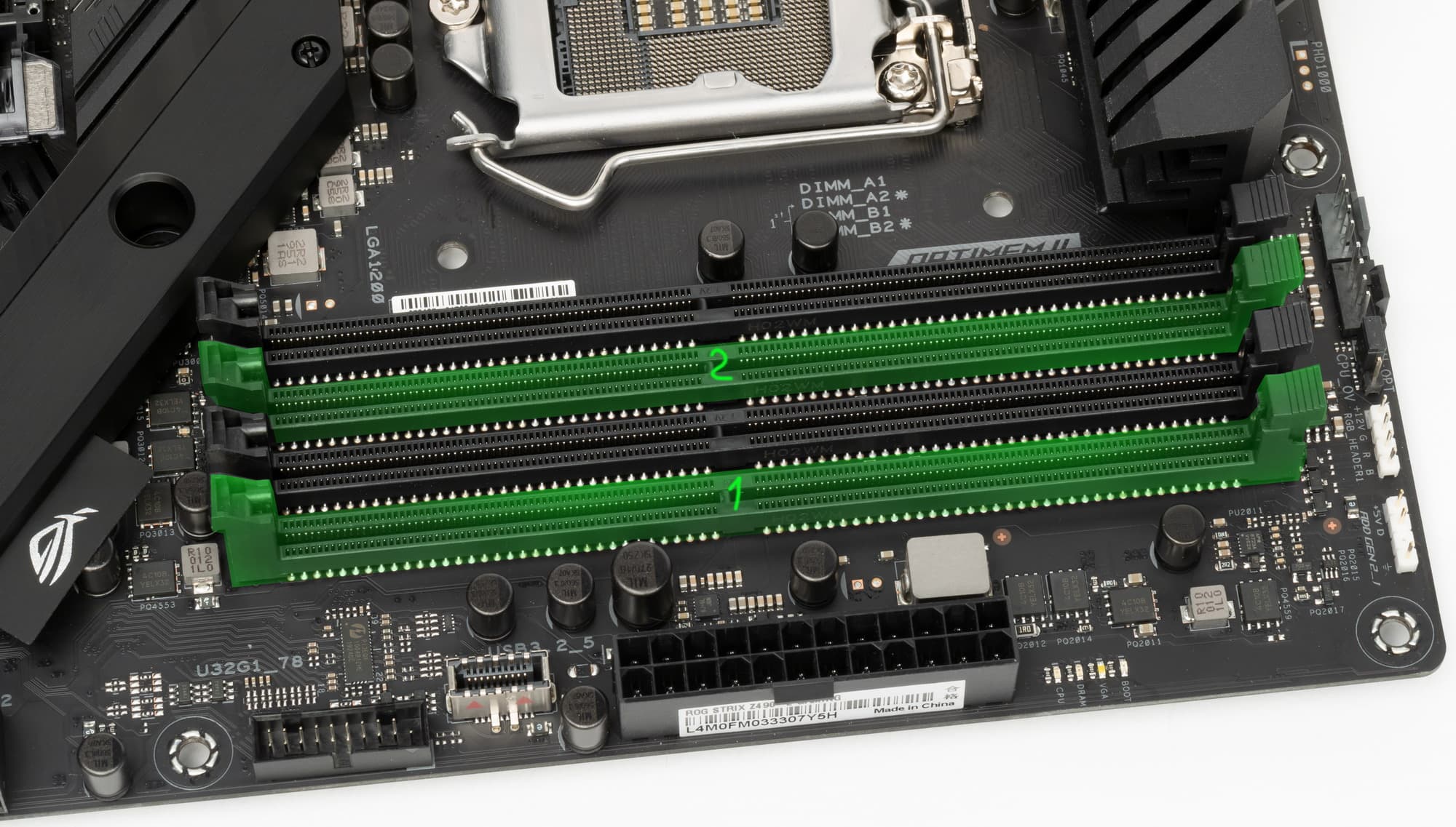 Для установки модулей памяти на плате ROG имеется четыре DIMM-слота (для работы памяти в Dual Channel в случае использования всего 2 модулей их следует устанавливать в А2 и B2. Плата поддерживает небуферизованную память DDR4 (non-EСС), а максимальный объем памяти составляет 128 ГБ (при использовании UDIMM последнего поколения по 32 ГБ). Разумеется, поддерживаются профили XMP.