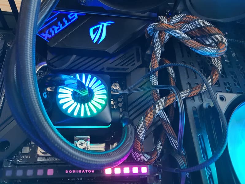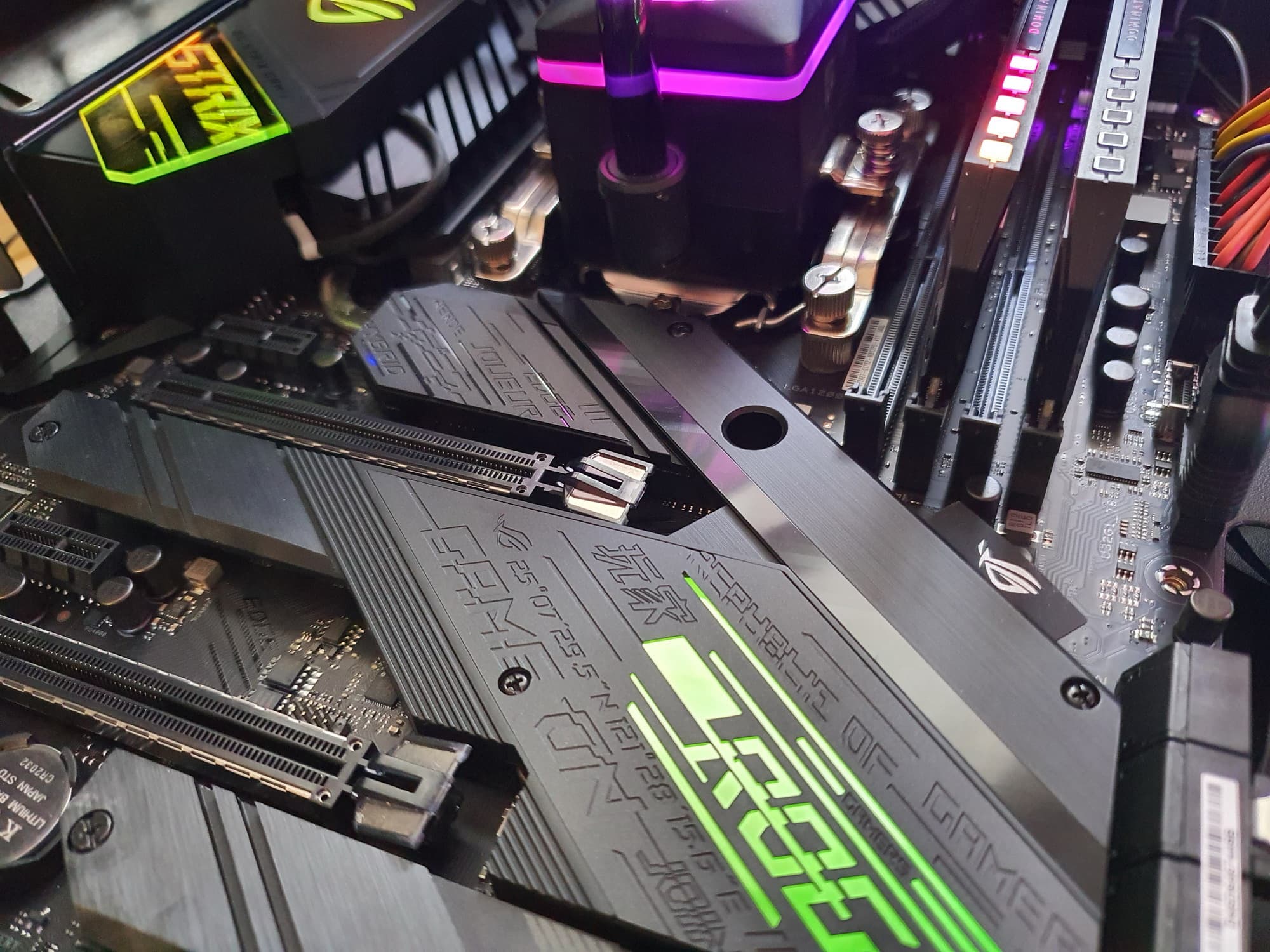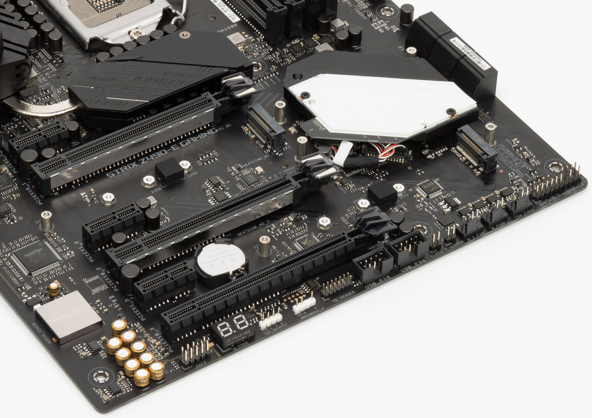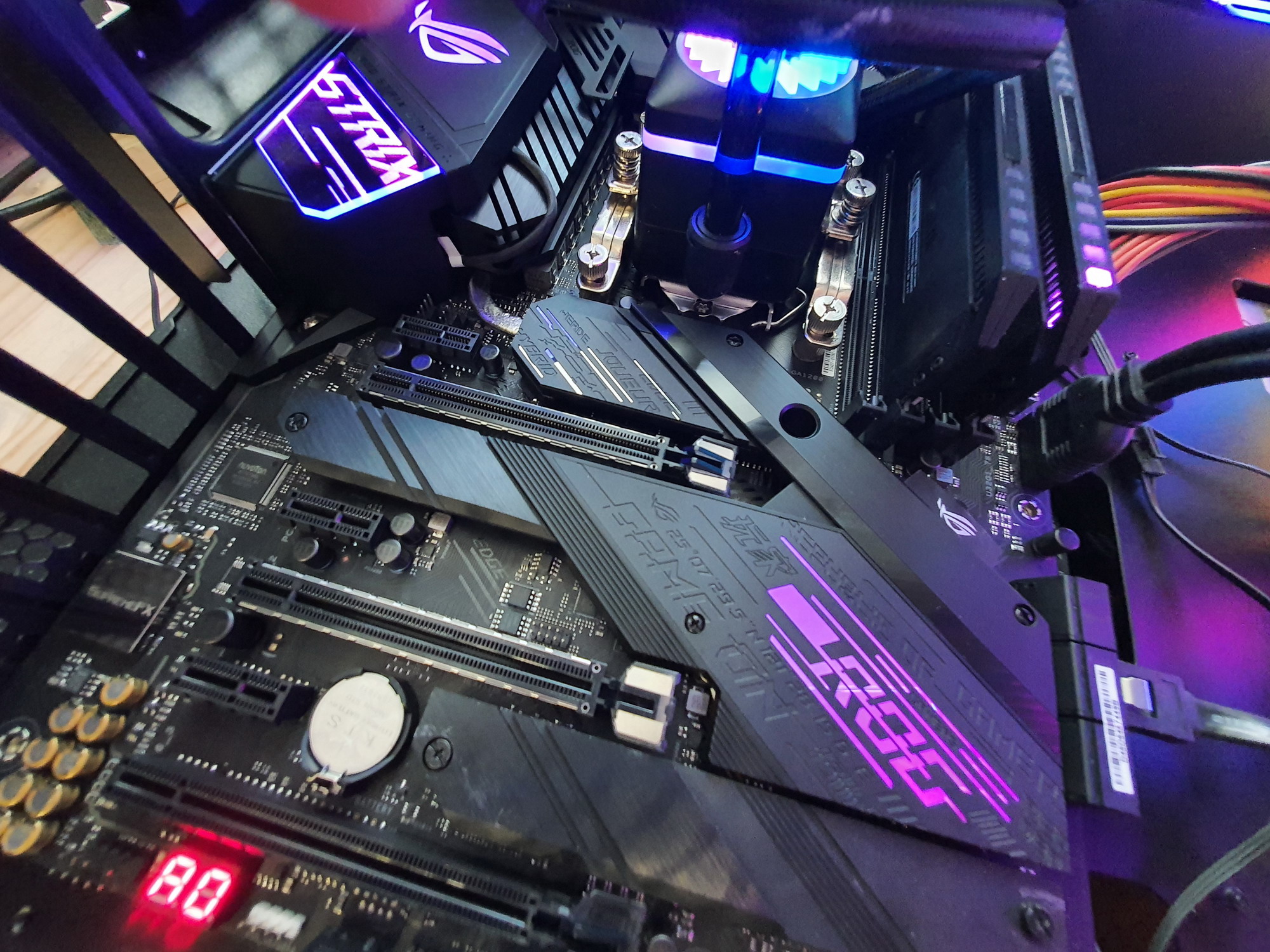 И напомню, что чипсетный радиатор тоже имеет пластиковый кожух, рассеивающий подсветку из светодиодов, установленных на самой PCB около Z490.