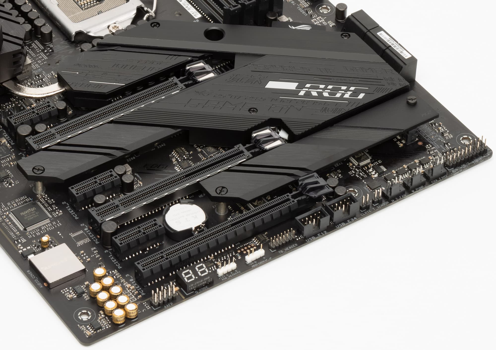 Как мы видим, охлаждение чипсета (один радиатор, к которому прижимается радиатор M.2_1, прикрытый декоративной пластиковой крышкой с рассеивателем подсветки в виде лого ROG) организовано отдельно от силовых преобразователей.