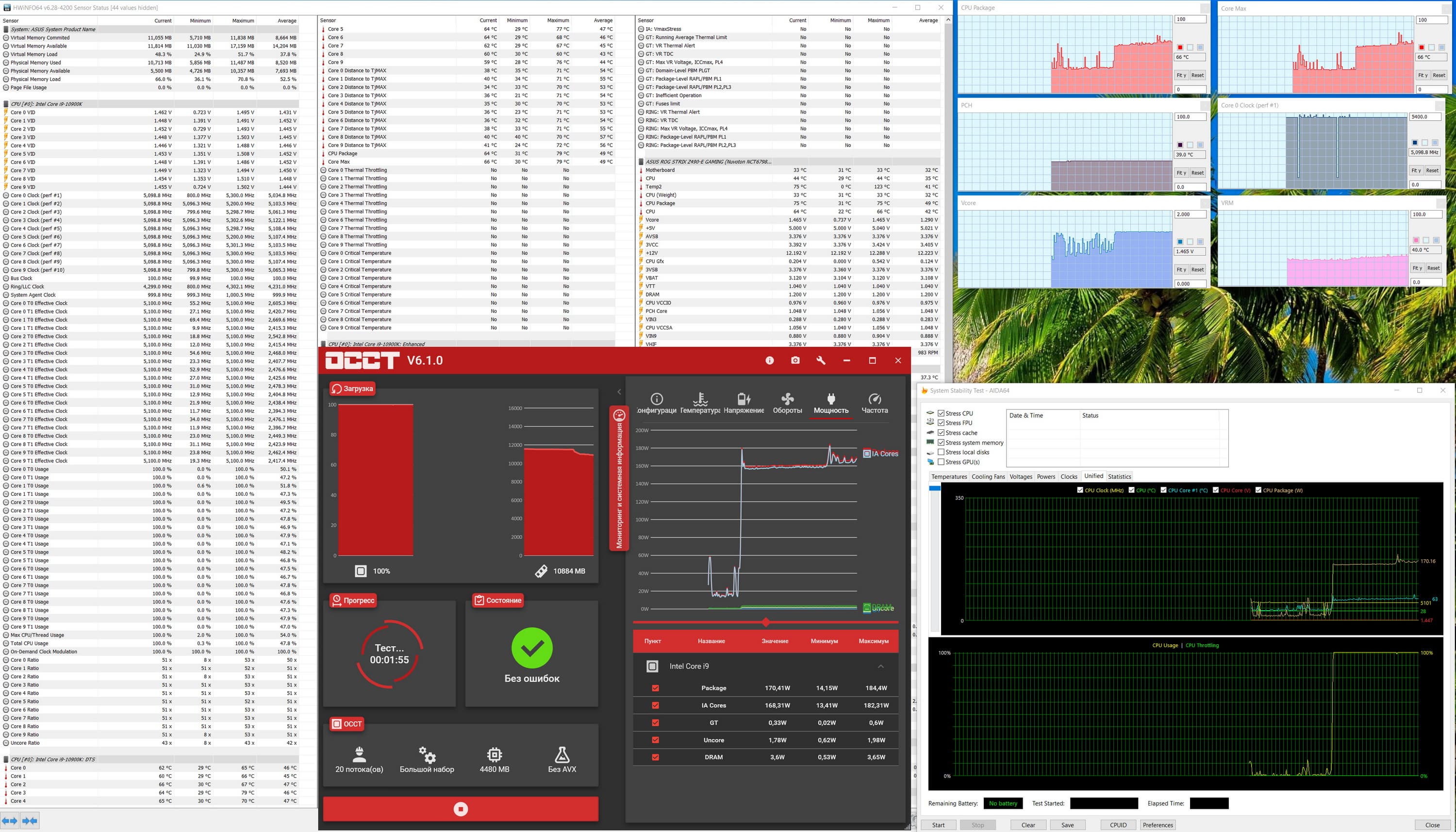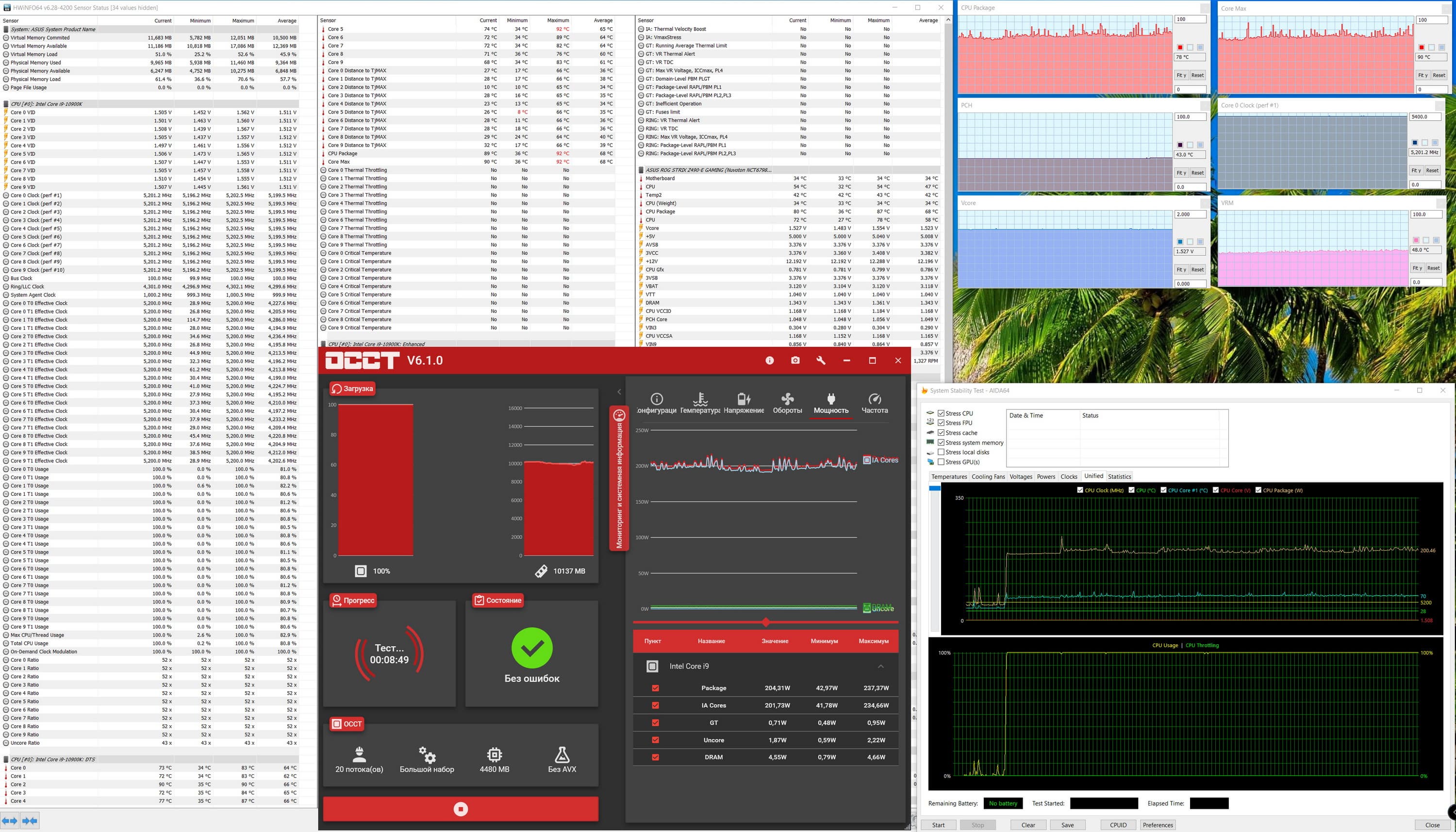 Если в самом начале работы не включить полностью MCE, то работа платы будет подчинена требованиям Intel PL и потому мы видим 4,9 ГГц по ядрам. При этом все параметры работы держались в норме, все вышеуказанные тесты прошли без проблем. Нагрев блока VRM и чипсета Z490 не превышал 42-44 °C, необычных явлений не замечено. Максимальное потребление процессором достигло величины в 152 Вт. Очень насторожил повышенный вольтаж на ядре процессора — 1,38 В. Совершенно не требуется такого напряжения для достижения 4,9 ГГц. Но пока на перегреве не сказалось.