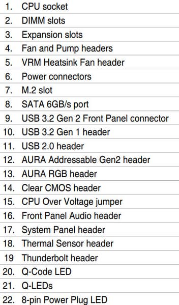 | Прочие внутренние элементы | 24-контактный разъем питания ATX 1 8-контактный разъем питания EPS12V 1 4-контактный разъем питания EPS12V 1 слот M.2 (E-key), занят адаптером беспроводных сетей 1 разъем для подключения порта USB 3.2 Gen2 Type-C 1 разъем для подключения 2 портов USB 3.2 Gen1 2 разъема для подключения 4 портов USB 2.0 8 разъемов для подключения 4-контактных вентиляторов и помп ЖСО 2 разъема для подключения неадресуемой RGB-ленты 2 разъема для подключения адресуемой ARGB-ленты 1 разъем аудио для передней панели корпуса 1 разъем Thunderbolt 1 разъем для термодатчика 2 разъема для подключения управления с передней панели корпуса 1 разъем включения режима CPU_OV |