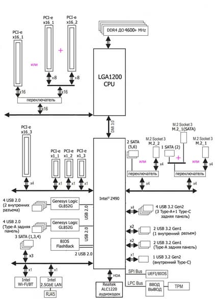 Процессоры Intel Core 10-го поколения (совместимые с сокетом LGA1200 и поддерживаемые Z490) имеют 16 линий ввода-вывода (включая PCIe 3.0), не имеют USB и SATA портов. При этом взаимодействие с Z490 идет по особому каналу Digital Media Interface 3.0 (DMI 3.0), и линии PCIe на это не расходуются. Все PCIe линии процессора идут на слоты расширения PCIe. Serial Peripheral Interface (SPI) используется для взаимодействия с системой UEFI/BIOS, а шина Low Pin Count (LPC) — для связи с устройствами ввода/вывода, не требующими высокой пропускной способности (контроллерами вентиляторов, TPM, старой периферии).