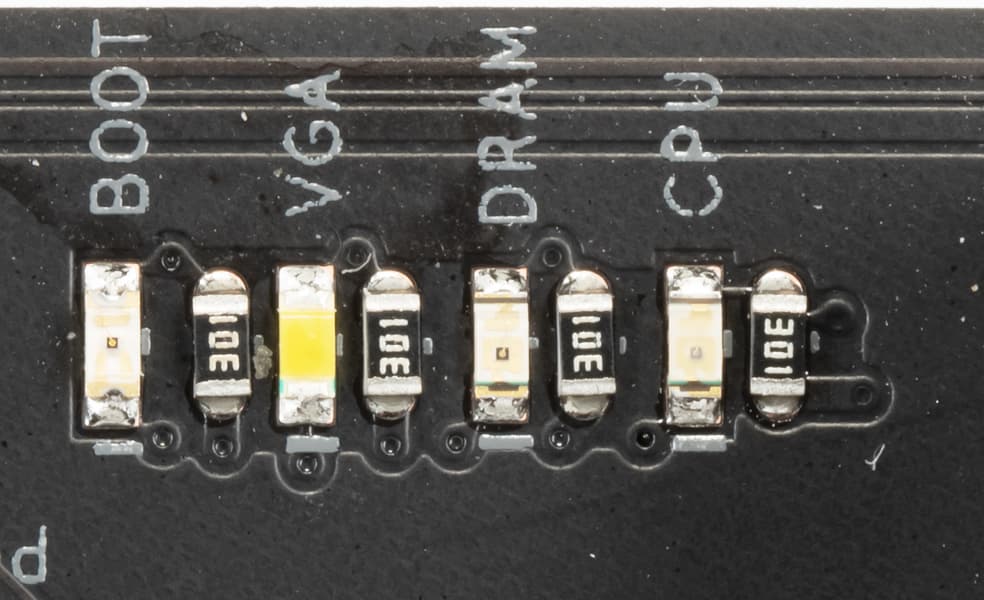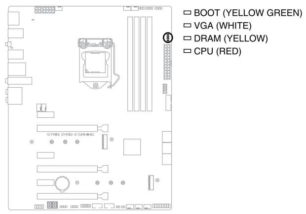 Если после включения компьютера к моменту перехода на загрузку ОС все индикаторы погасли, то проблем нет. В ролике (на примере ROG Maximus XII Extreme) ниже это хорошо видно, смысл светодиодов тот же самый и на этой плате.