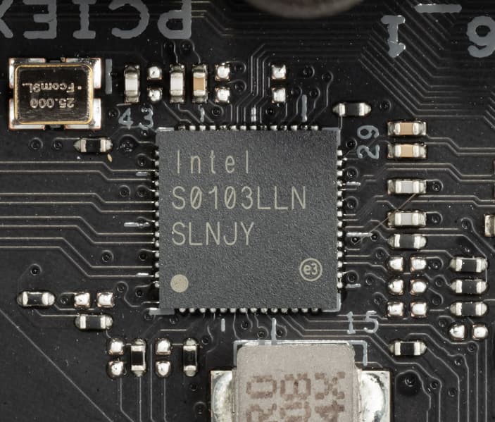 Материнская плата оснащена средствами связи хорошо. Имеется скоростной Ethernet-контроллер Intel I225-V, способный работать по стандарту 2,5 Гбит/с.