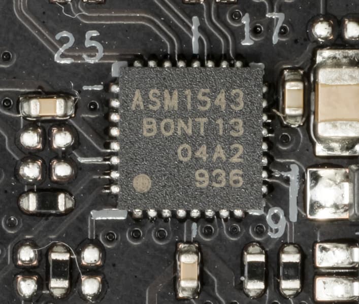 Все самые быстрые USB порты Type-A/Type-C оснащены ре-драйверами ASM1543 от ASMedia, дающими устойчивый вольтаж, способный обеспечить быструю зарядку мобильных гаджетов через них.