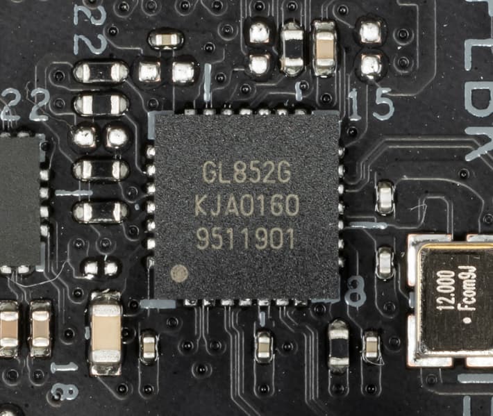 - 8 портов USB 2.0/1.1: 4 реализованы через один контроллер Genesys Logic GL852G (на него потрачен 1 порт USB 2.0 от Z490) и представлены двумя внутренними разъемами (каждый на 2 порта); еще 4 реализованы через второй Genesys Logic GL852G (на него потрачен 1 порт USB 2.0 от Z490) и представлены портами Type-A на задней панели (черные).