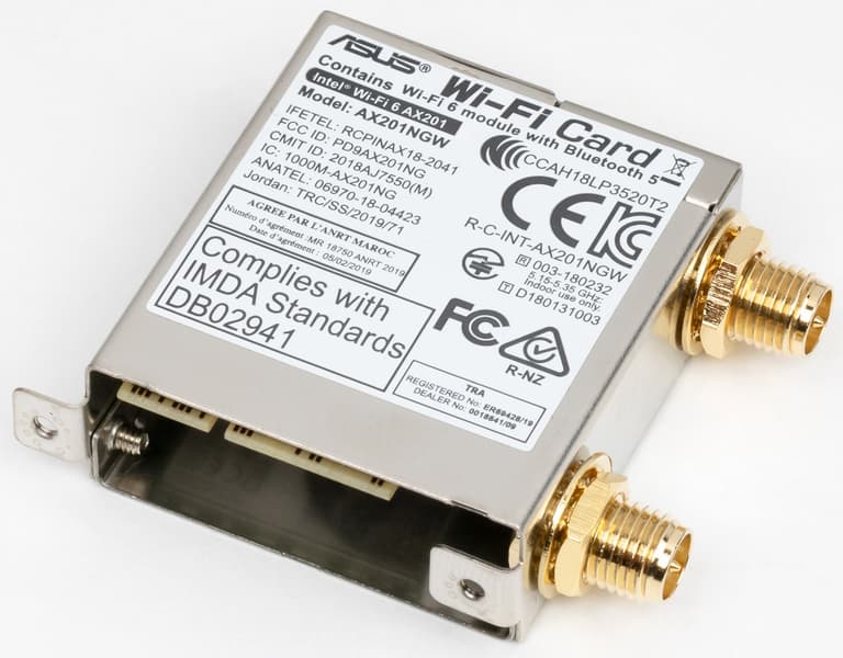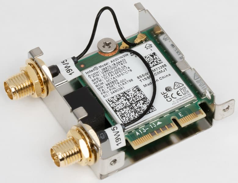 Имеется и комплексный беспроводной адаптер на контроллере Intel AX201NGW, через который реализованы Wi-Fi (802.11a/b/g/n/ac/ax) и Bluetooth 5.0. Он установлен в слот M.2 (E-key), и его разъемы для привинчивания выносных антенн выведены на заднюю панель.