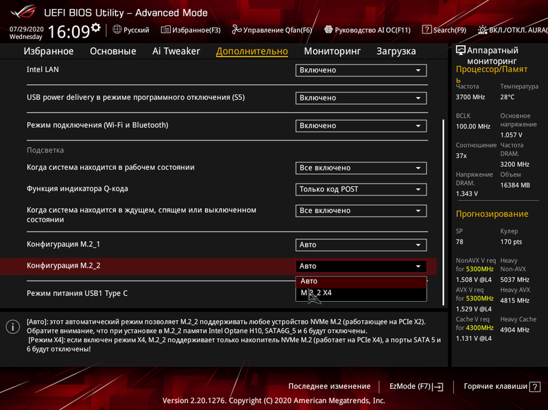 - Переключатель: или порты SATA_5/6 (2 линии), или слот M.2_2 (4 линии): максимум 4 линии;
