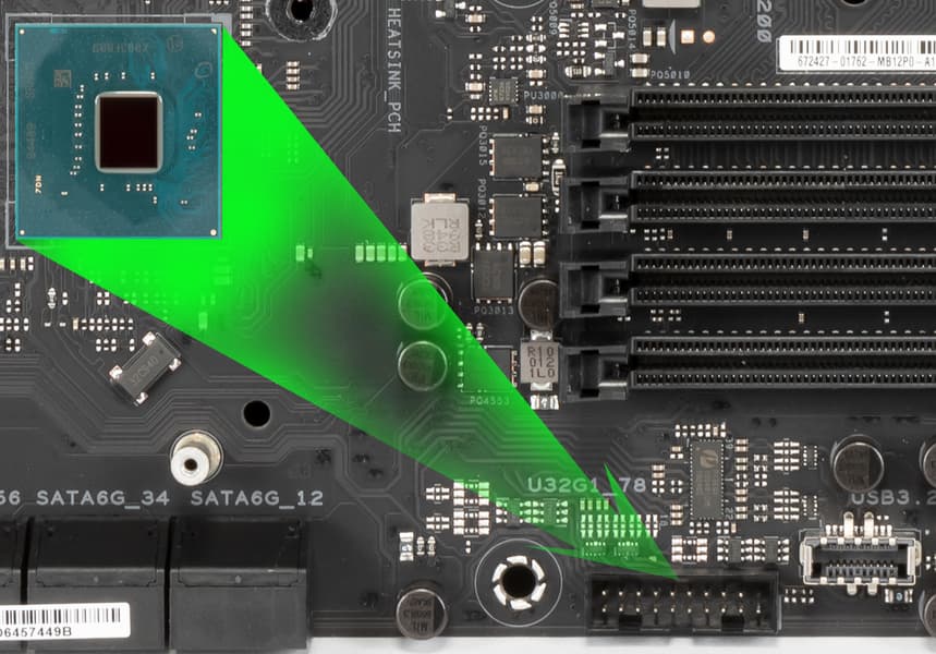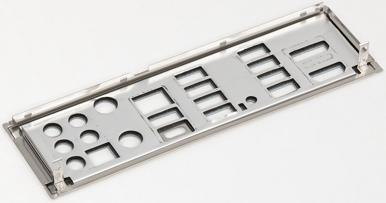 В отличие от слотов для памяти, два слота PCIe x16_1/2 имеют металлическое армирование из нержавеющей стали, которое увеличивает их надежность (что может быть важным в случае довольно частой смены видеокарт, но что более важно: такой слот легче выдержит нагрузку на изгиб в случае установки очень тяжелой видеокарты топового уровня). Кроме того, такая защита предохраняет слоты от электромагнитных помех.