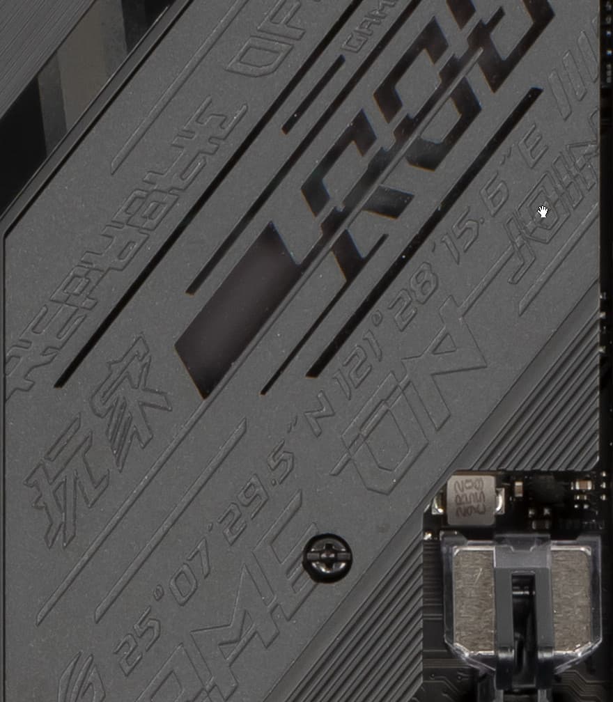 Кстати, у платы есть и еще одна «пасхалочка». Если внимательно посмотреть на радиатор чипсета, то можно увидеть ряд чисел. А знаки между ними явно говорят о том, что это координаты.