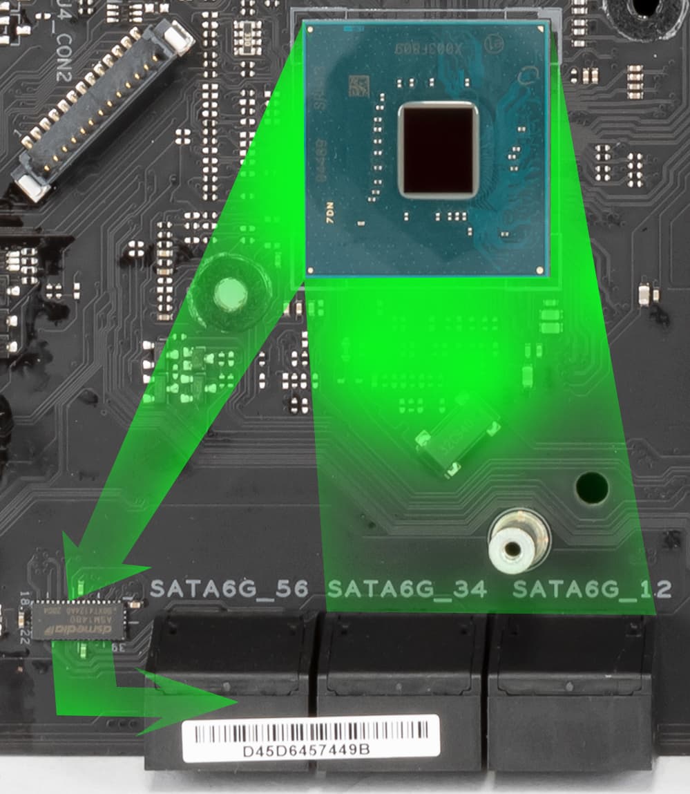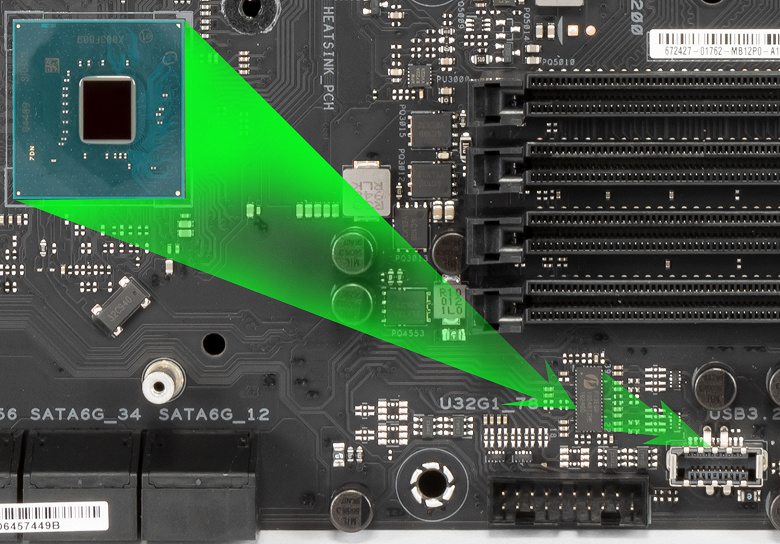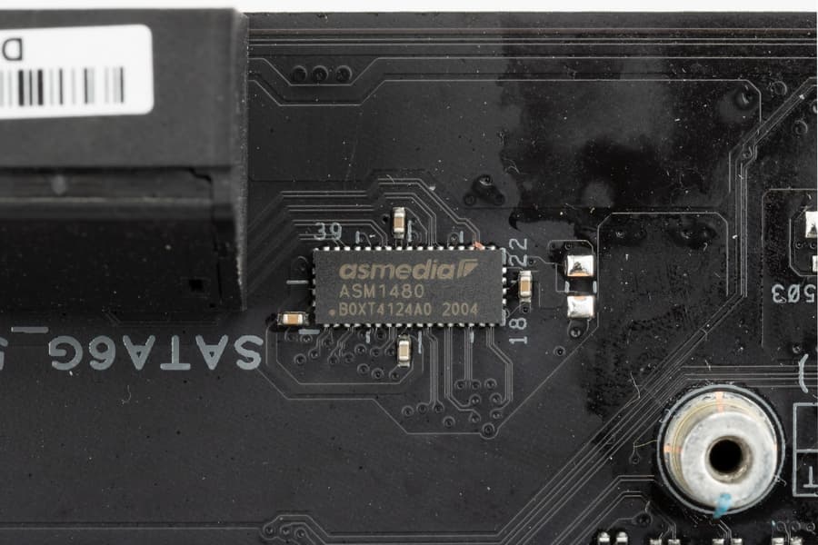 Напомню, что порты SATA 5,6 делят ресурсы с портом M.2_2, поэтому есть мультиплексор ASM1480.