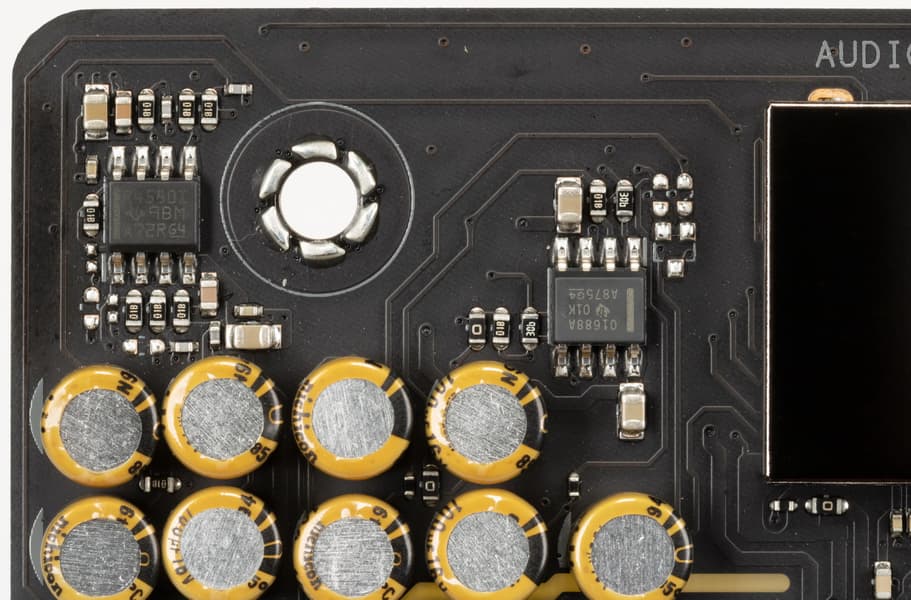 В аудиоцепях платы применяются «аудиофильские» конденсаторы Nichicon Fine Gold.