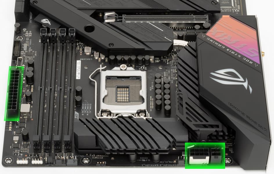 Форм-фактор ATX имеет размеры до 305×244 мм, а E-ATX — до 305×330 мм. Материнская плата ROG Strix Z490-E Gaming имеет размеры 305×244 мм, поэтому выполнена в форм-факторе ATX, и на ней имеются 9 монтажных отверстий для установки в корпус.