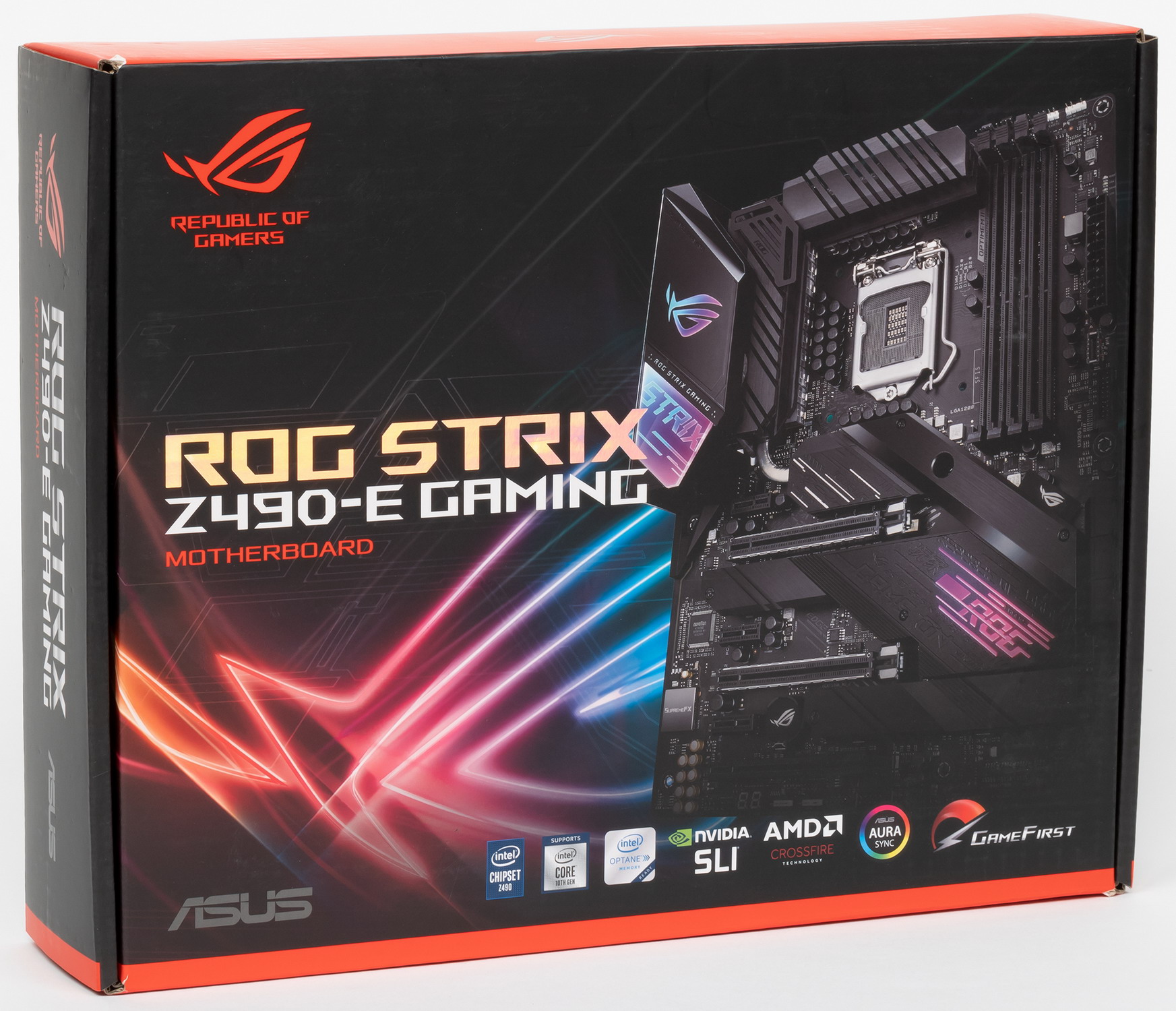 ROG Strix Z490-E Gaming поставляется в стандартной коробке с яркой обложкой и фирменным дизайном ROG.