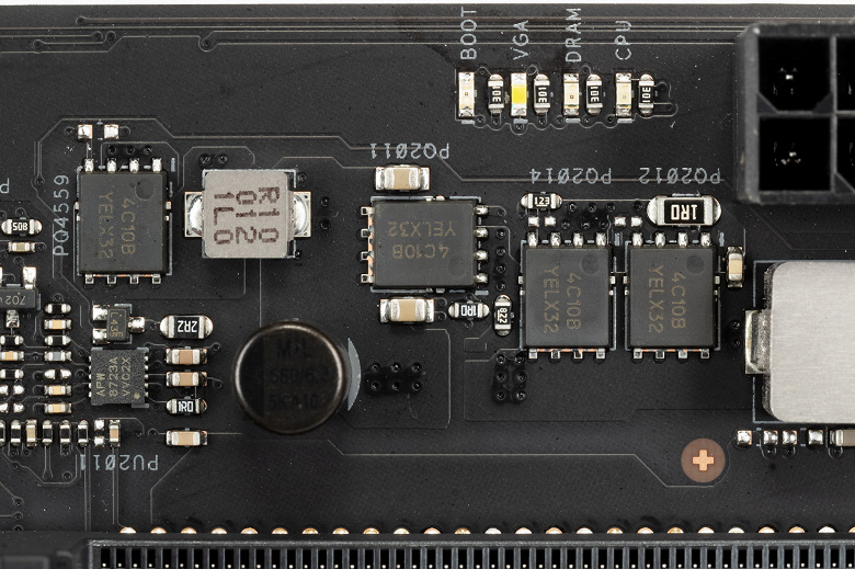 Их бывает много у самой флагманской платы, и крайне мало на этой плате. Нет ни кнопок питания и перезагрузки, ни иных перемычек, кнопок или переключателей для оверклокеров.Ну за исключением вот лишь переключателя для разрешения излишнего повышения напряжения на процессоре (по умолчанию в BIOS есть лимиты в этом плане).