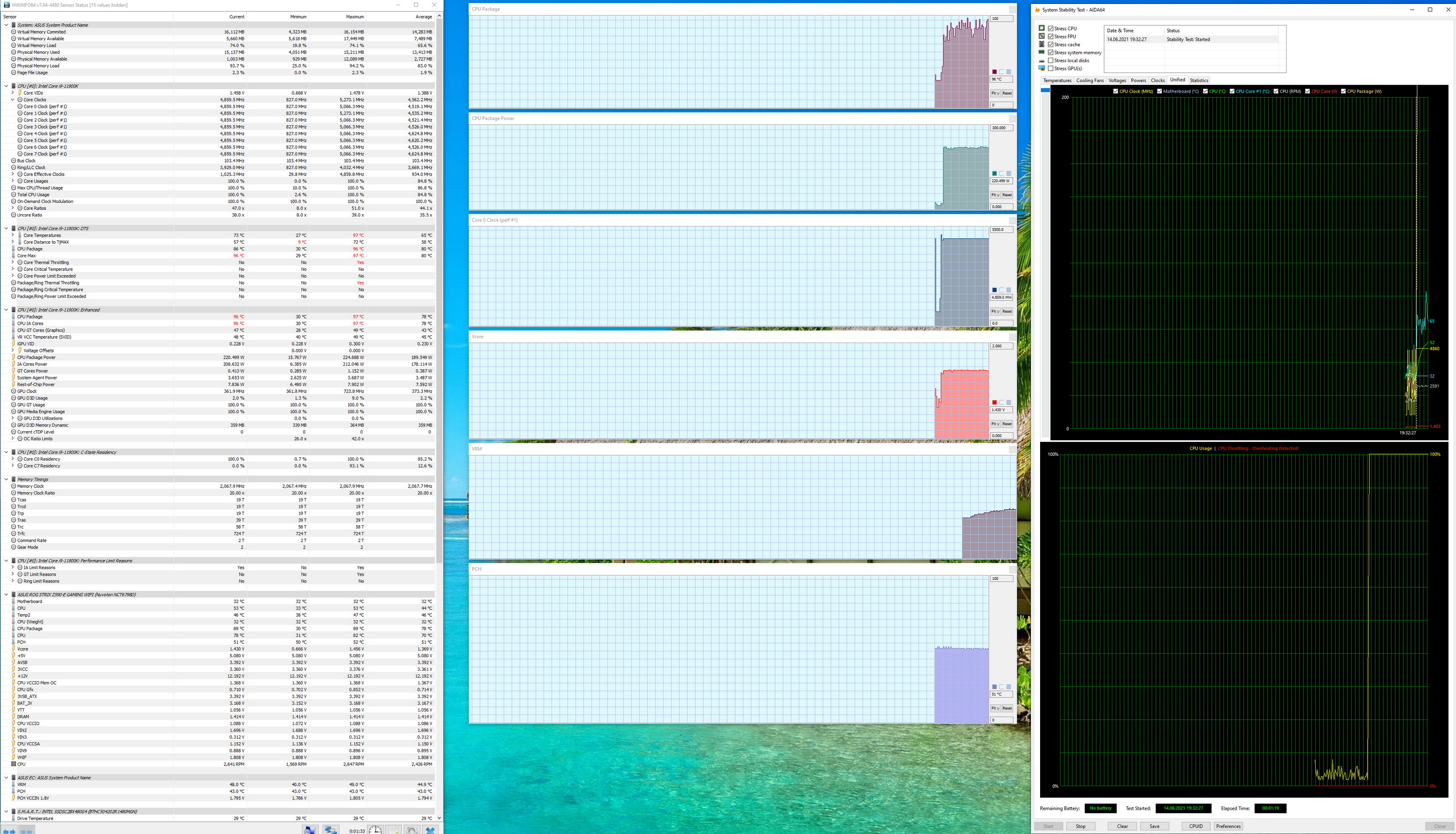 Сходу очевидно, что по умолчанию система регулировки питания слишком высоко подняла вольтаж на ядре процессора (до 1,45 В), даже самая продвинутая СЖО с такой «печкой» не справилась бы. И как результат: легкий перегрев процессора даже на частотах 4,8 ГГц по всем ядрам. Да, пока еще все эти автоматические системы разгона дают сбой на новых процессорах 11ххх, требуется установка напряжения на процессоре вручную. Поэтому что-то говорить о том, что 11ххх лучше, чем 10ххх пока как-то сложно. Мы помним, что тот же 10900К легко шел на 5.1 ГГц по всем десяти(!) ядрам, а тут на восьми получить 4.9 ГГц практически нереально.