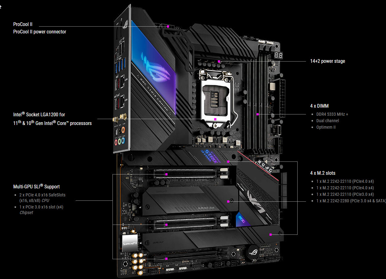 Asus ROG Strix Z590-E Gaming WiFi хоть и является представителем топовой серии ROG, но все же имеет относительно приемлемую стоимость в районе 30 с небольшим тысяч рублей. А ведь это продвинутая материнская плата с поддержкой процессоров Intel Core 11-го поколения, созданная для хардкорных геймеров, у нее имеются 17 портов USB разных видов, включая 2 самых быстрых USB 3.2 Gen2×2 и 3 очень быстрых USB 3.2 Gen2. Плата также предлагает 3 слота PCIe х16 (два из которых получают от процессора 16 линий PCIe, причем версии 4.0 в случае использования процессоров 11-го поколения), аж 4(!) слота M.2 (один из них подключен напрямую к процессору линиями PCIe 4.0, еще один также может подключаться к процессору, но для этого придется уменьшить количество линий PCIe для слотов PCIe x16).