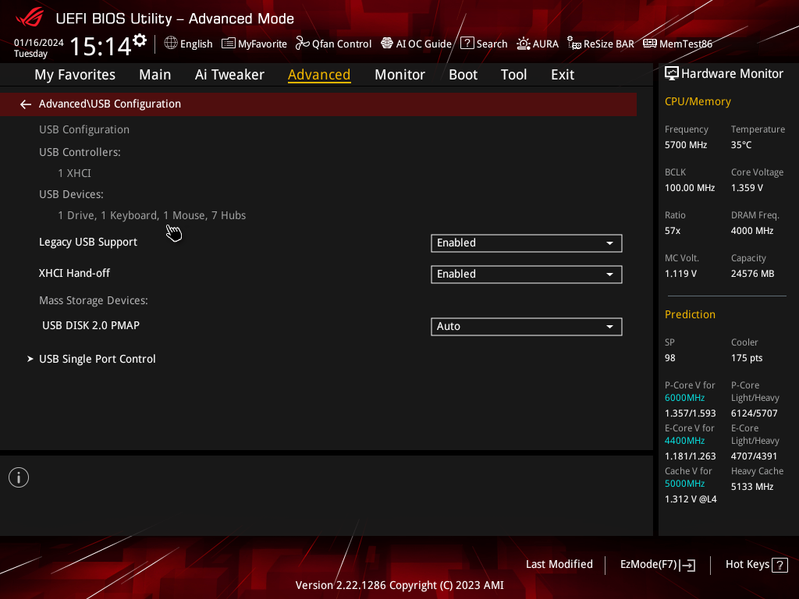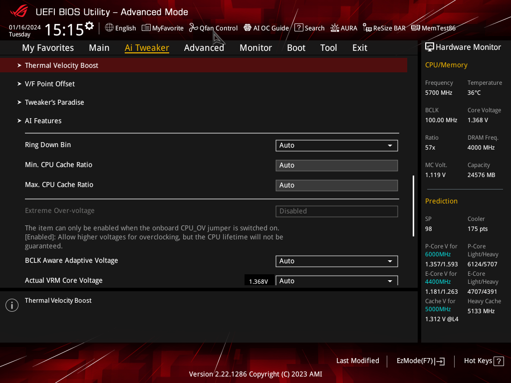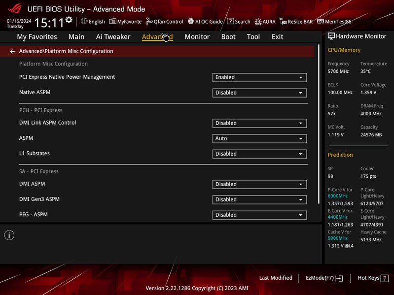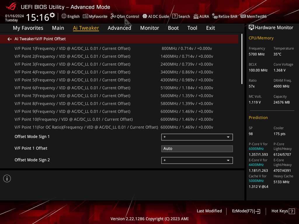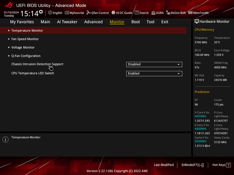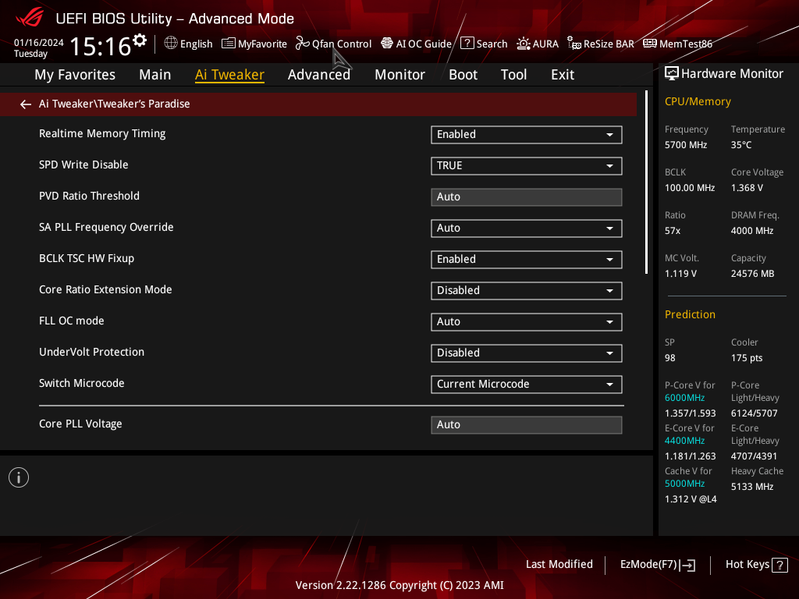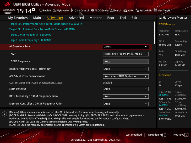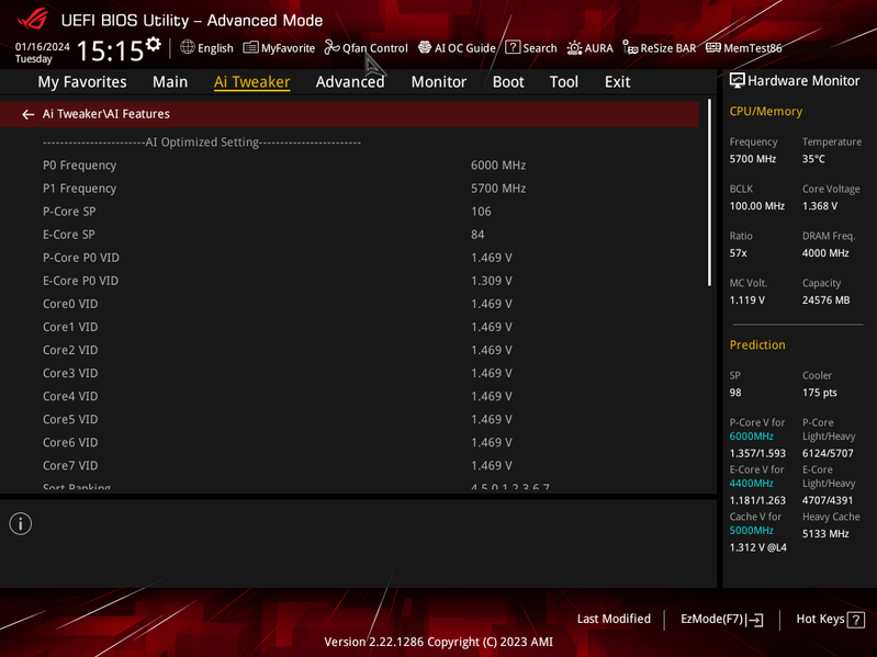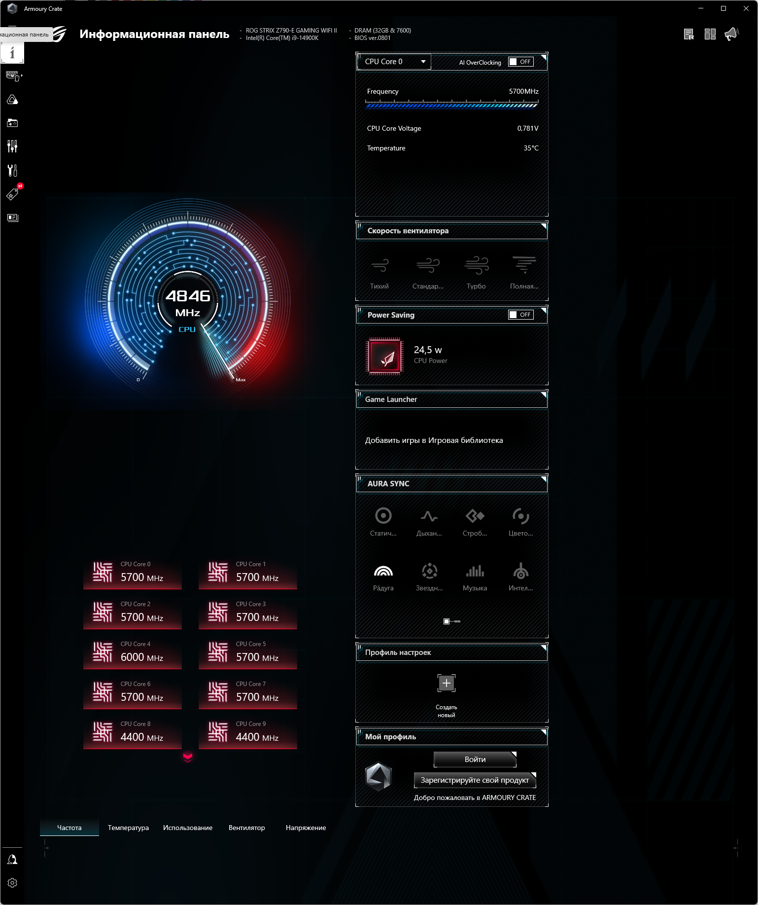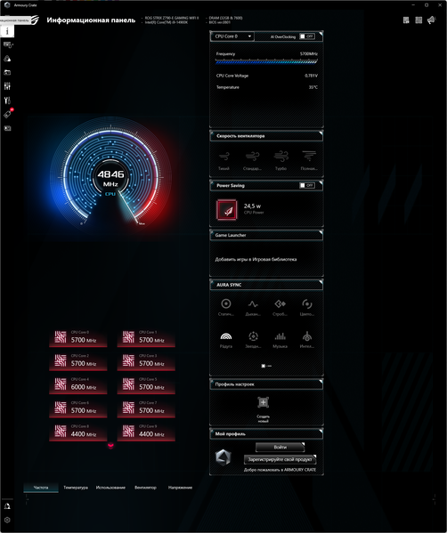 В режиме авторазгона мы получили уже привычные по многим матплатам старшего уровня 5,7 ГГц по всем P-ядрам (2-поточным), и 4,4 ГГц по всем Е-ядрам (однопоточным). Было определено очень мощное питание матплаты, поэтому система выставила очень приличный авторазгон. Все остальные параметры системы по нагреву компонентов были в норме.