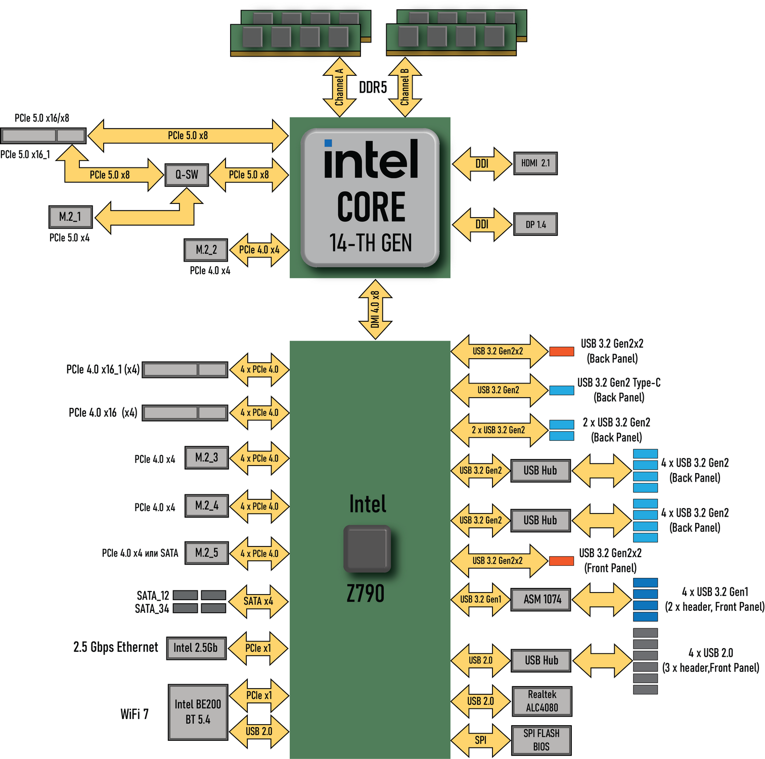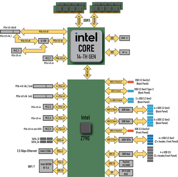 Процессоры Intel Core 14/13/12-го поколений (совместимые с сокетом LGA1700 и поддерживаемые Z790) имеют 20 линий ввода-вывода (16 PCIe 5.0, 4 PCIe 4.0), не имеют USB и SATA портов. При этом взаимодействие с Z790 идет по особому каналу Digital Media Interface 4.0 (DMI 4.0 x8). Все PCIe линии процессора идут на слоты расширения PCIe и порт М.2. Serial Peripheral Interface (SPI) используется для взаимодействия с системой UEFI/BIOS, а шина Low Pin Count (LPC) — для связи с устройствами ввода/вывода, не требующими высокой пропускной способности (контроллерами вентиляторов, TPM, старой периферии).