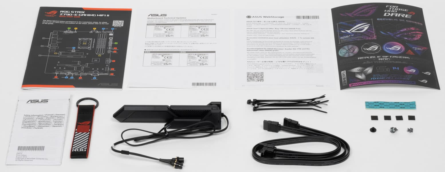 Asus ROG Strix Z790-E Gaming WiFi II поставляется в традиционной коробке фирменного дизайна серии ROG. Комплект размещен под платой в отдельном отсеке.