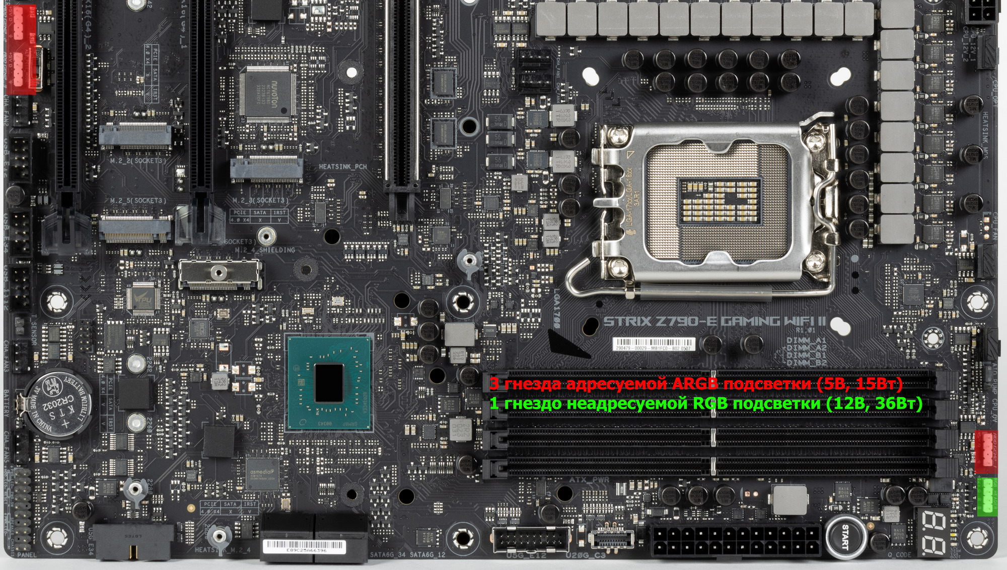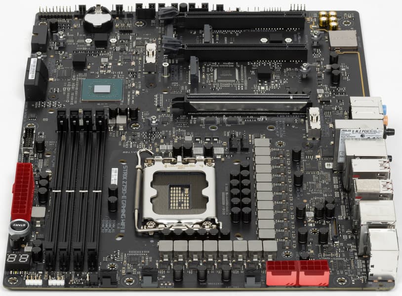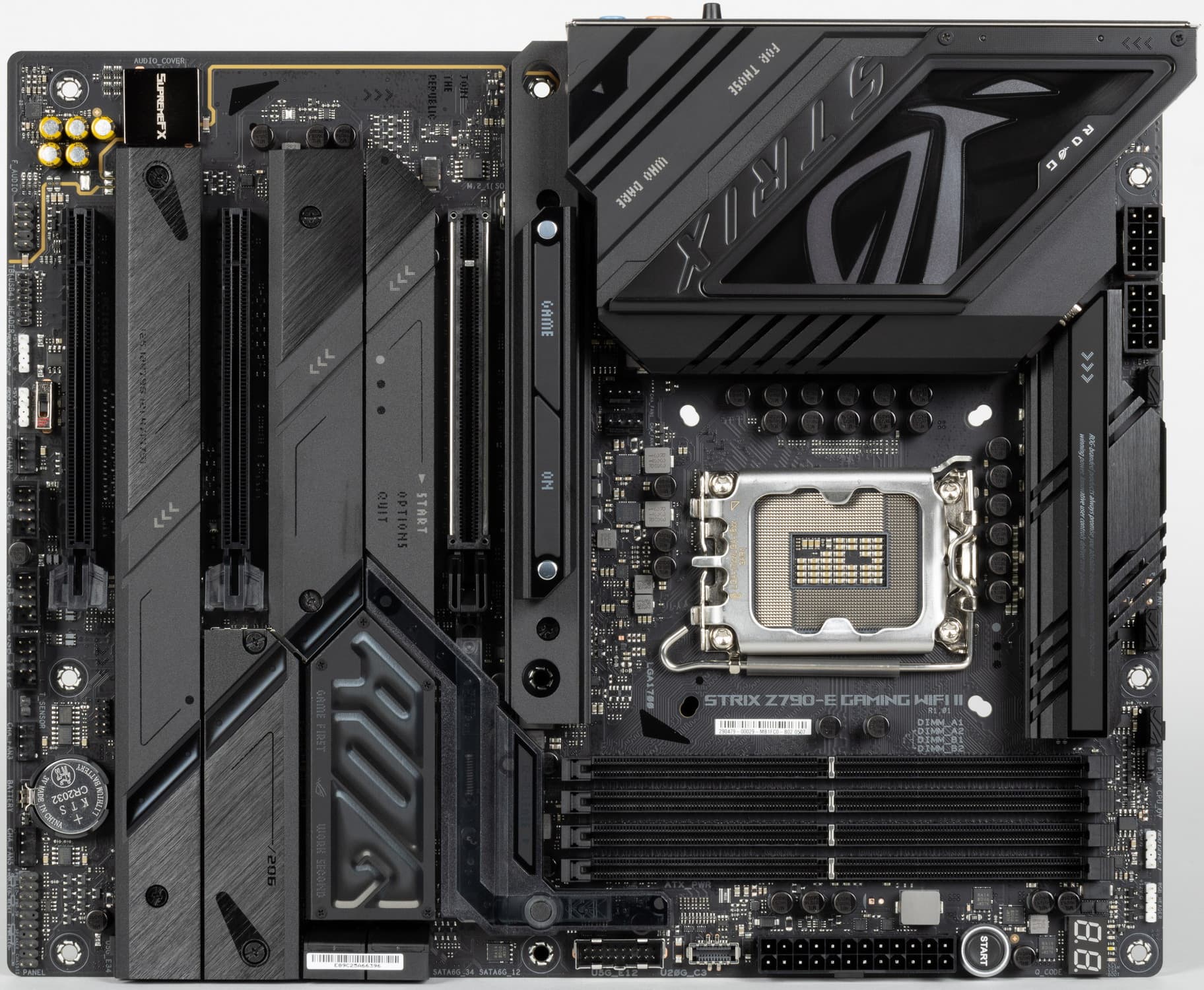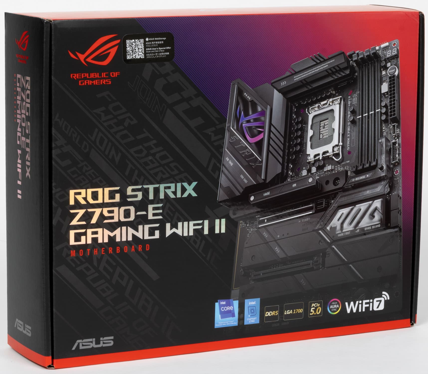 Переходим к самой материнской плате Asus ROG Strix Z790-E Gaming WiFi II, которая относится к топовому суббренду ROG, внутри которого есть еще свое деление: самые флагманские платы относятся к линейке Maximus, а попроще – к Strix: поэтому перед нами как бы середнячок, но из топового семейства.