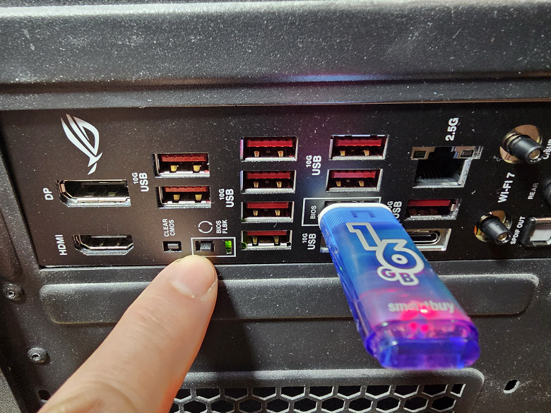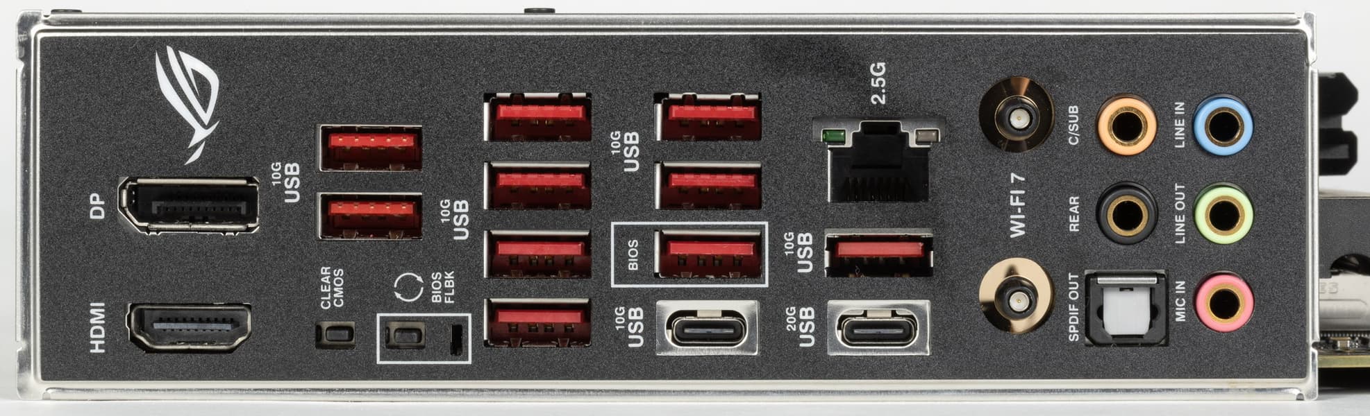 | Разъемы на задней панели | 1 × USB 3.2 Gen2x2 (Type-C) 1 × USB 3.2 Gen2 (Type-C) 10 × USB 3.2 Gen2 (Type-A) 1 × RJ-45 5 аудиоразъемов типа миниджек 1 × S/PDIF (оптический, выход) 1 × HDMI 2.1 1 × DP 1.4a 2 антенных разъема кнопка перепрошивки BIOS — Flashback |