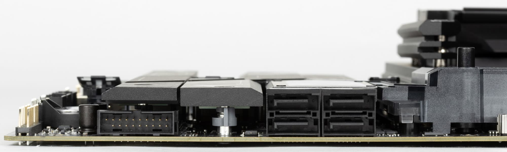 Как я уже упоминал ранее, M.2 слоты также имеют радиаторы: у верхнего M.2_1 — свой персональный усиленный радиатор (по сути там два радиатора, соединенных тепловой трубкой), у M.2_3 и M.2_4 – также свои отдельные радиаторы, а вот у M.2_2 и M.2_5 — общий.