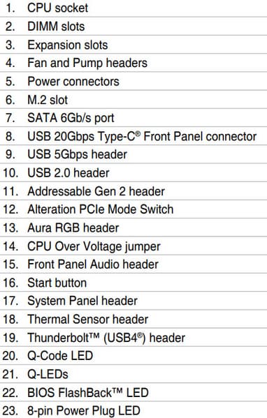 | Прочие внутренние элементы | 24-контактный разъем питания ATX 2 8-контактных разъема питания EPS12V 1 слот M.2 (E-key), занят адаптером беспроводных сетей 1 разъем для подключения порта USB 3.2 Gen2x2 Type-C 2 разъема для подключения 4 портов USB 3.2 Gen1 3 разъема для подключения 6 портов USB 2.0 8 разъемов для подключения 4-контактных вентиляторов и помп ЖСО 1 разъем для подключения неадресуемой RGB-ленты 3 разъема для подключения адресуемой ARGB-ленты 1 разъем аудио для передней панели корпуса 1 разъем для подключения дискретных карт Thunderbolt4 1 переключатель версии PCIe 1 разъем для термодатчикa 1 разъем для подключения управления с передней панели корпуса 1 кнопка включения питания Power |