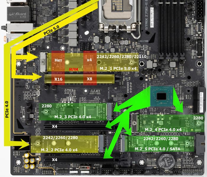 Третий, четвертый и пятый слоты M.2 (M.2_3, M.2_4, M.2_5) получают данные от чипсета Z790, а первые два — от CPU, при этом M.2_1 соединен линиями PCIe 5.0, а M.2_2 – PCIe 4.0.