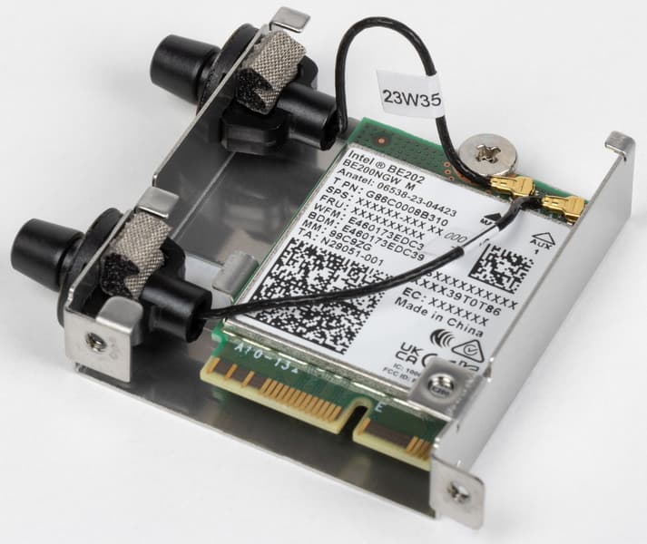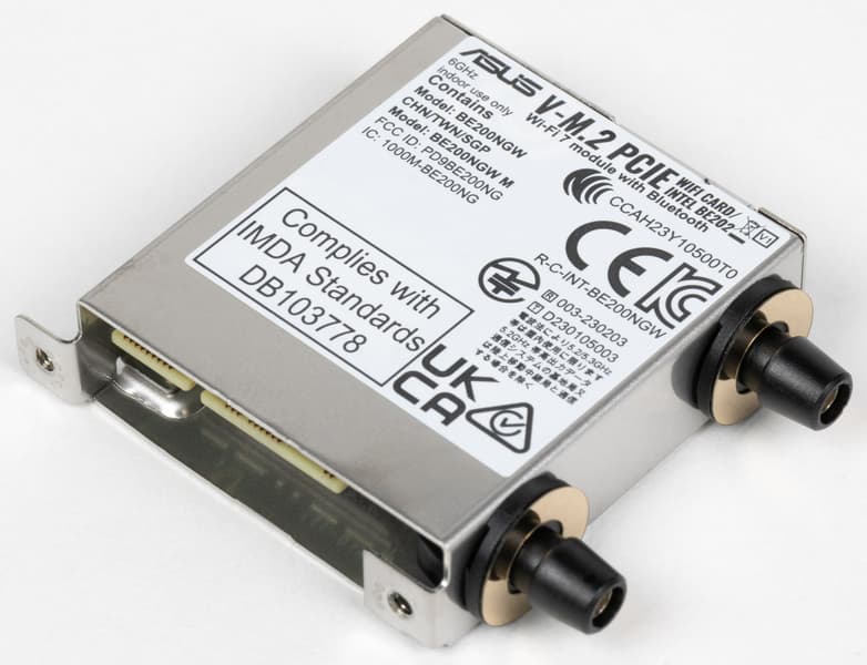 Имеется и самый современный комплексный беспроводной адаптер на контроллере Intel BE202NGW, через который реализованы Wi-Fi 7 (802.11a/b/g/n/ac/ax/be) и Bluetooth 5.4. Он установлен в слот M.2 (E-key), и его разъемы для подключения выносных антенн выведены на заднюю панель.