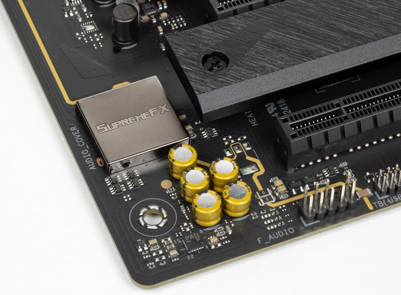 Мы знаем, что ранее самым популярным в большинстве современных материнских платах звуковым кодеком был Realtek ALC1220, обеспечивающий вывод звука по схемам до 7.1 с разрешением до 24 бит / 192 кГц . Ныне на матплатах топового уровня встречается уже ALC4080 того же производителя с улучшенными характеристиками 32 бит / 384 кГц. В традициях Asus прикрывать аудиокодек металлическим кожухом, назвав все это SupremeFX.