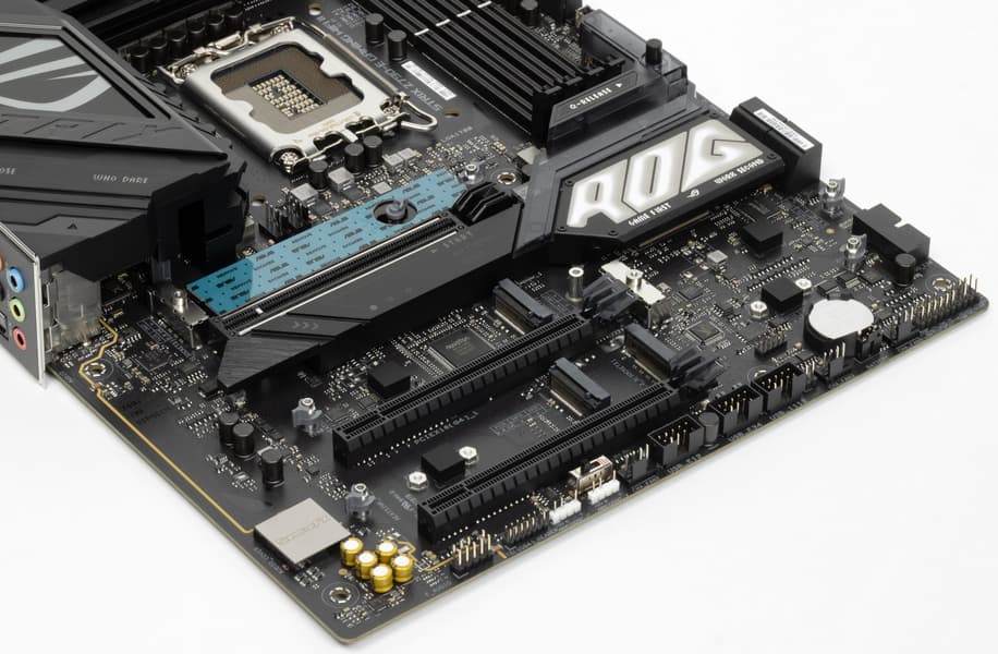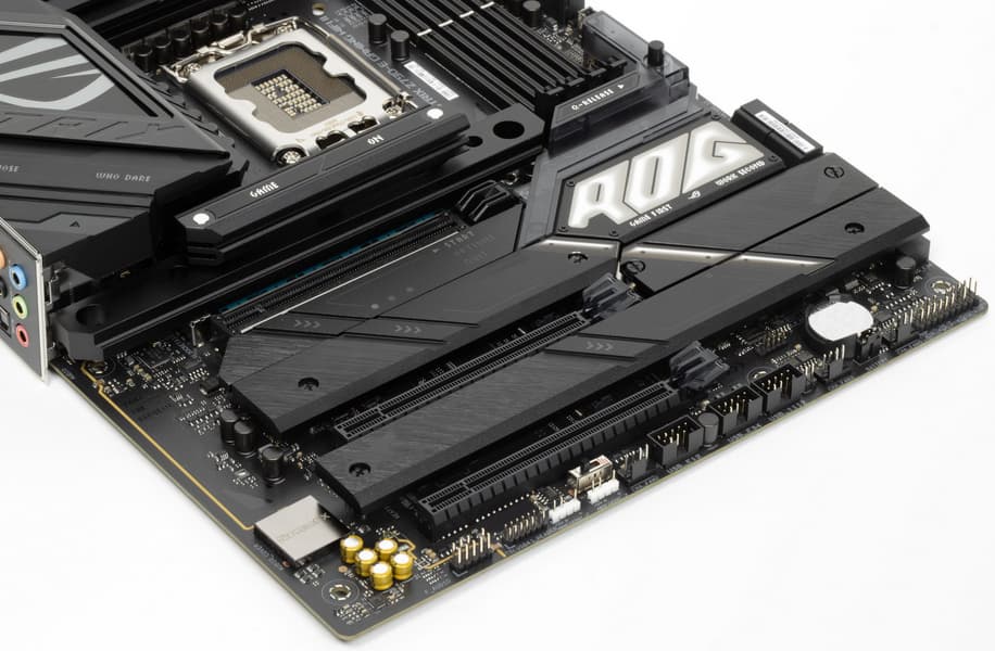 У Asus ROG Strix Z790-E Gaming WiFi II имеется 23 порта USB разных видов, включая 11 (!) очень быстрых USB 3.2 Gen2, а также два USB 3.2 Gen2×2 в виде внутреннего и внешнего Type-C. Плата предлагает 3 «длинных» слота PCIe, но только один — реально х16, получающий от процессора 16 линий PCIe, причем версии 5.0, а два других получают данные от чипсета и работают в режиме х4. Также у платы 5 слотов M.2: два подключены напрямую к процессору (один линиями PCIe 5.0, второй — PCIe 4.0), три других подключены к чипсету Z790 линиями PCIe 4.0. Надо отметить, что слот М.2, подключенный линиями PCIe 5.0 к процессору, готов к установке SSD самого последнего поколения, но делит ресурсы с соответствующим слотом PCIe x16, переводя его в режим х8.