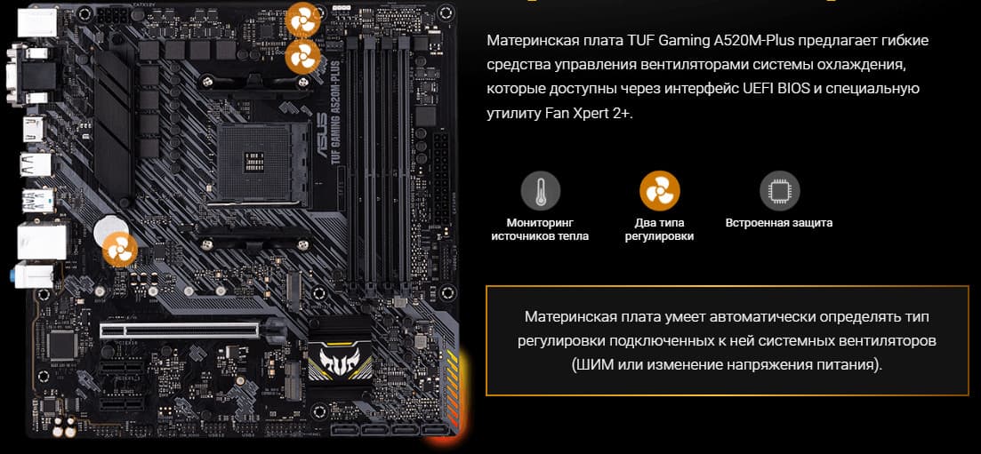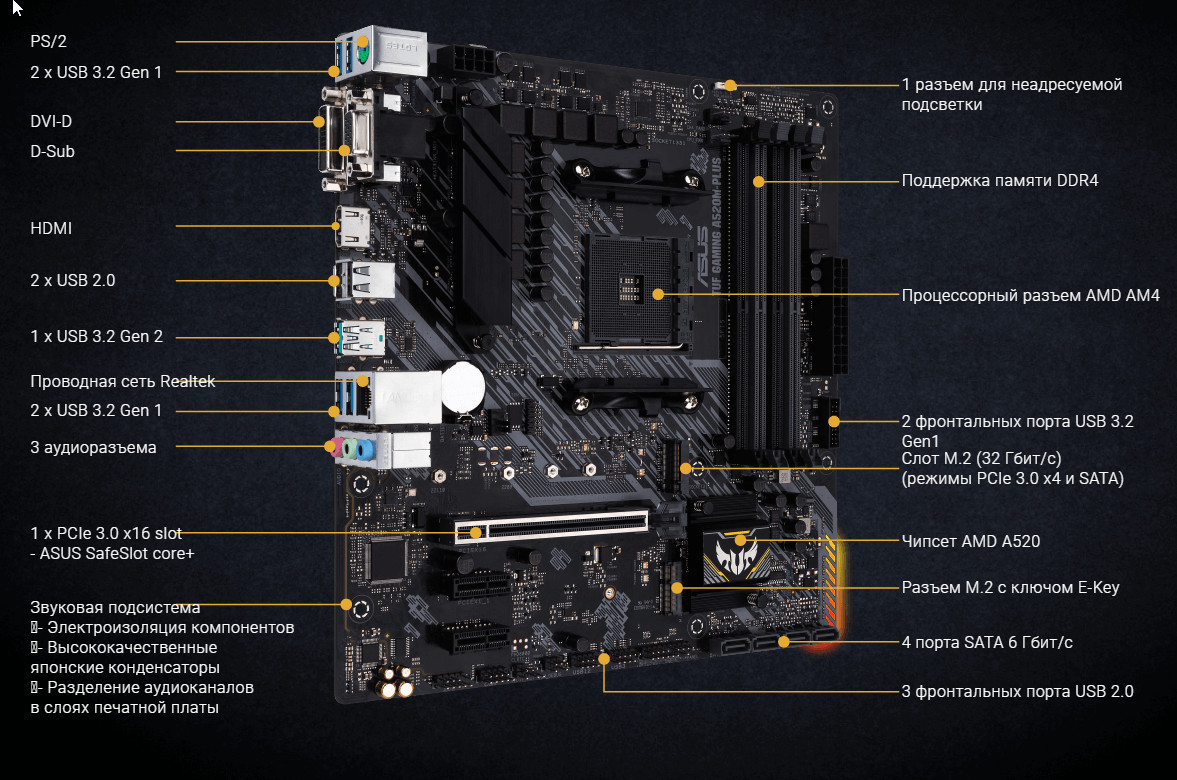 Материнская плата Asus TUF Gaming A520M-Plus ориентирована на самых нетребовательных геймеров, которые хотят получить бюджетное решение для относительно небольшого игрового ПК. Данная модель форм-фактора microATX обеспечивает достаточное питание для очень приличного авторазгона процессоров среднего уровня (Ryzen 5 3500-3600 и аналогичных 5-го поколения).