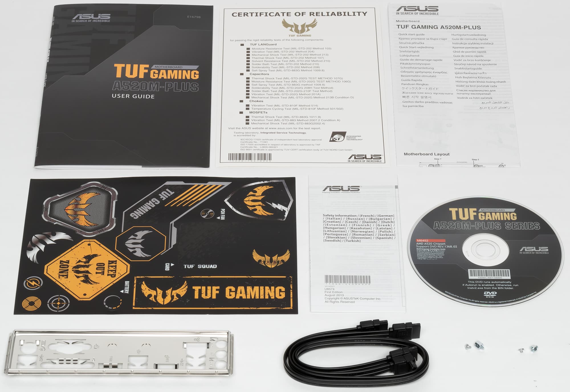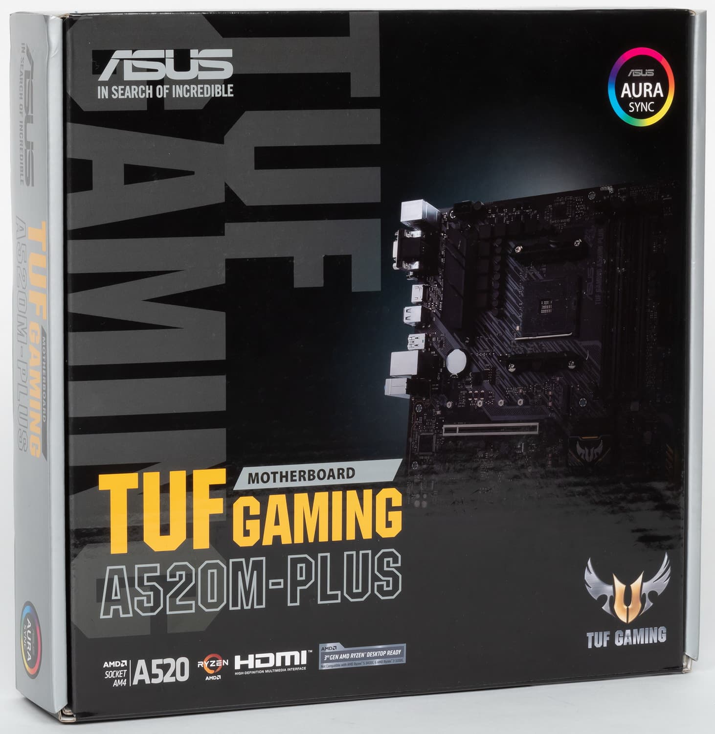 Asus TUF Gaming A520M-Plus поставляется в стандартной коробке фирменного дизайна серии (в черно-серых тонах). Комплект размещен под платой в отдельном отсеке.