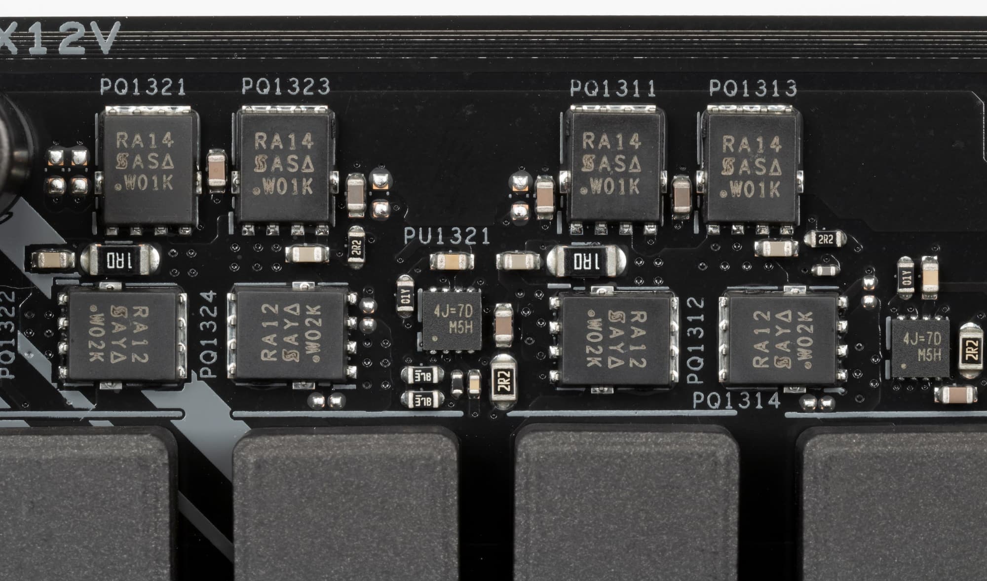 Каждый канал фазы имеет суперферритовый дроссель и набор полевых транзисторов SIRA14DB от Vishay (до 20А).