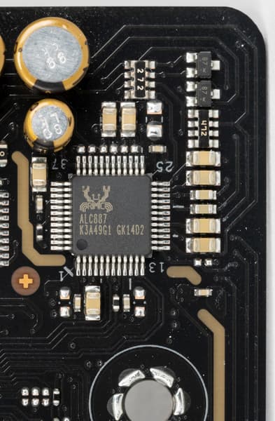 Мы знаем, что почти во всех современных материнских платах звуковым кодеком является продукт от Realtek, обеспечивающий вывод звука по схемам до 7.1, в последнее время это стал ALC4080 с характеристиками 32 бит / 384 кГц. До того мы несколько лет лицезрели ALC1220 с характеристиками по-проще. Однако в данном случае применен очень старый Realtek ALC887 (который как-то даже дико характеризовать как 7.1).