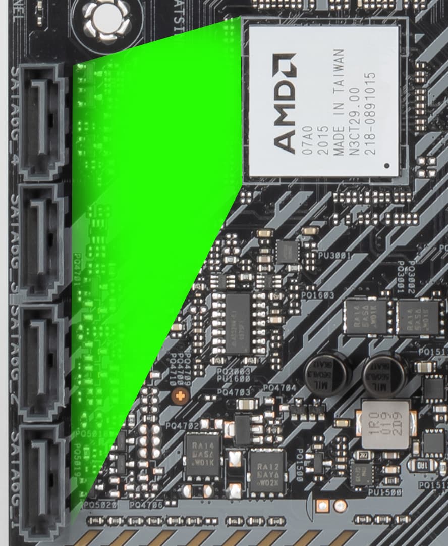 Первый «процессорный» слот PCIe x16 имеет металлическое армирование из нержавеющей стали, которое увеличивает их надежность (что может быть важным в случае довольно частой смены видеокарт, но что более важно: такой слот легче выдержит нагрузку на изгиб в случае установки очень тяжелой видеокарты топового уровня. Кроме того, такая защита предохраняет слоты от электромагнитных помех.