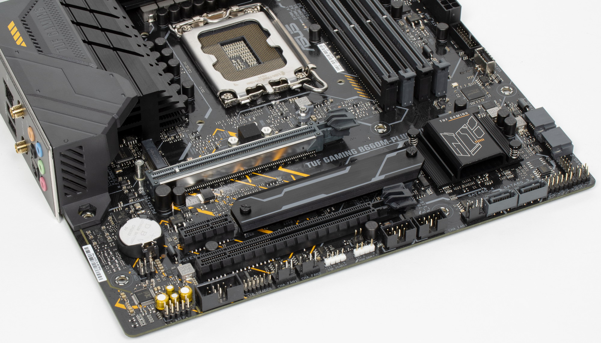 У платы 15 USB-портов, включая один самый быстрый USB 3.2 Gen2×2, 4 USB 3.2 Gen2 и 4 USB 3.2 Gen1. Два «длинных» слота PCIe х16 разные: первый получает от процессора 16 линий PCIe, причем версии 5.0, второй — х4. Также есть один слот PCIe x1. Для накопителей предлагаются 2 слота M.2 (один из них подключен напрямую к процессору линиями PCIe 4.0, другой подключен к чипсету B660 линиями PCIe 4.0) и 4 порта SATA. Сетевые возможности неплохи: один быстрый проводной контроллер 2,5 Гбит/с и один современный беспроводной. Подсветка у платы практически отсутствует, но есть 4 гнезда для подключения внешних устройств подсветки.